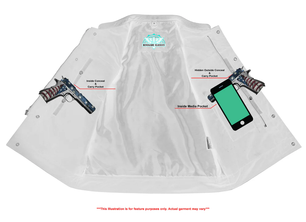 This style features two concealed carry pockets located between the snaps and zipper. These pockets are made from durable textiles and contain built-in holsters and snap closures.