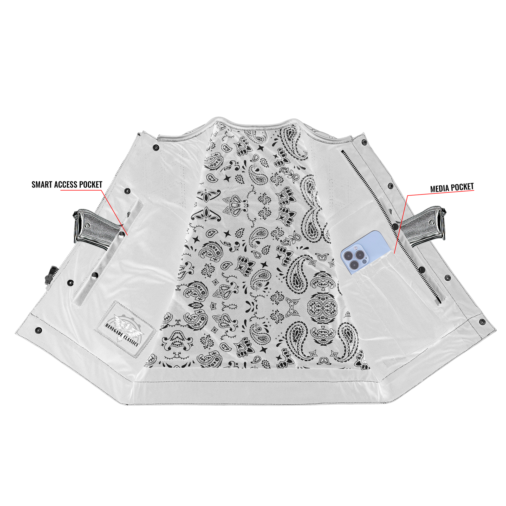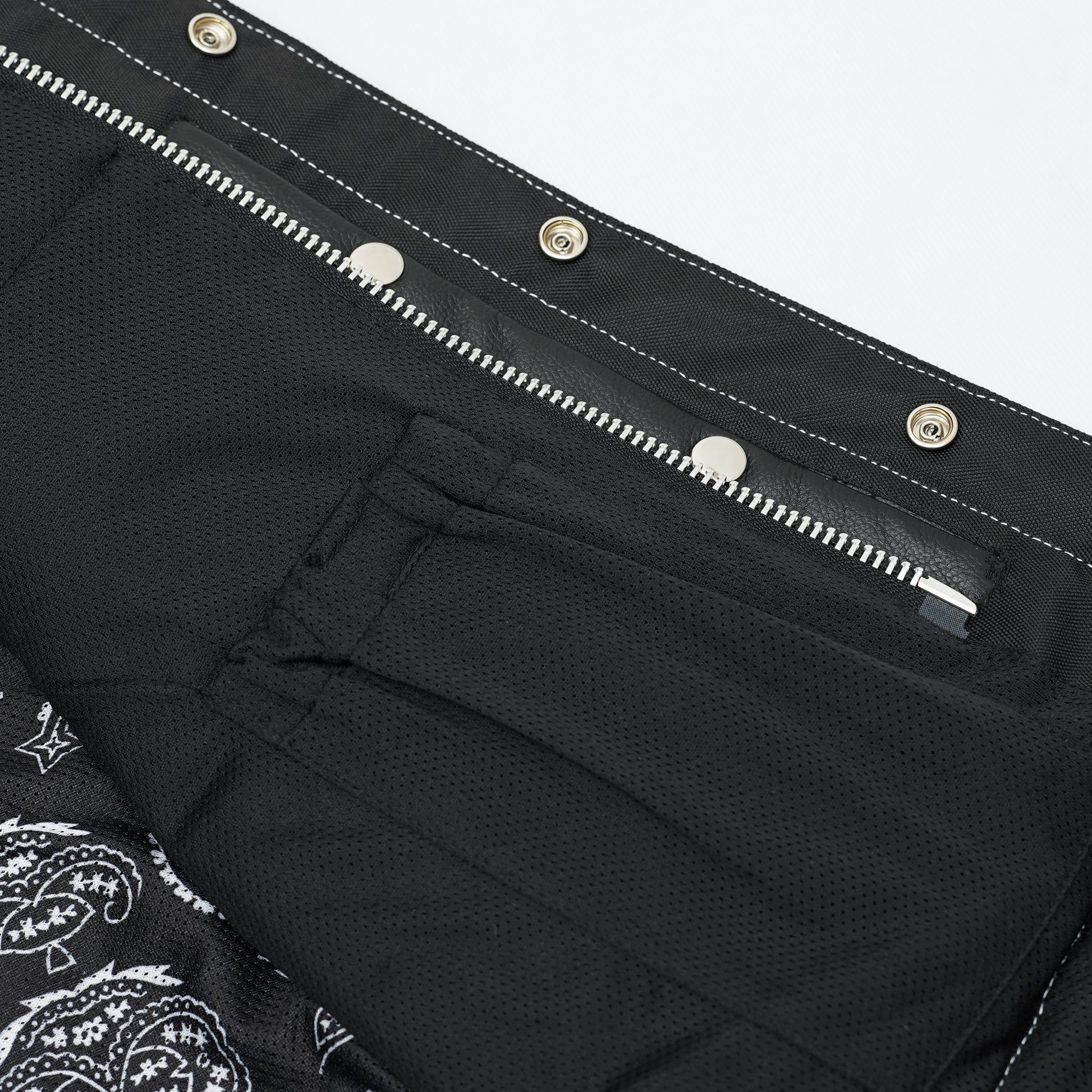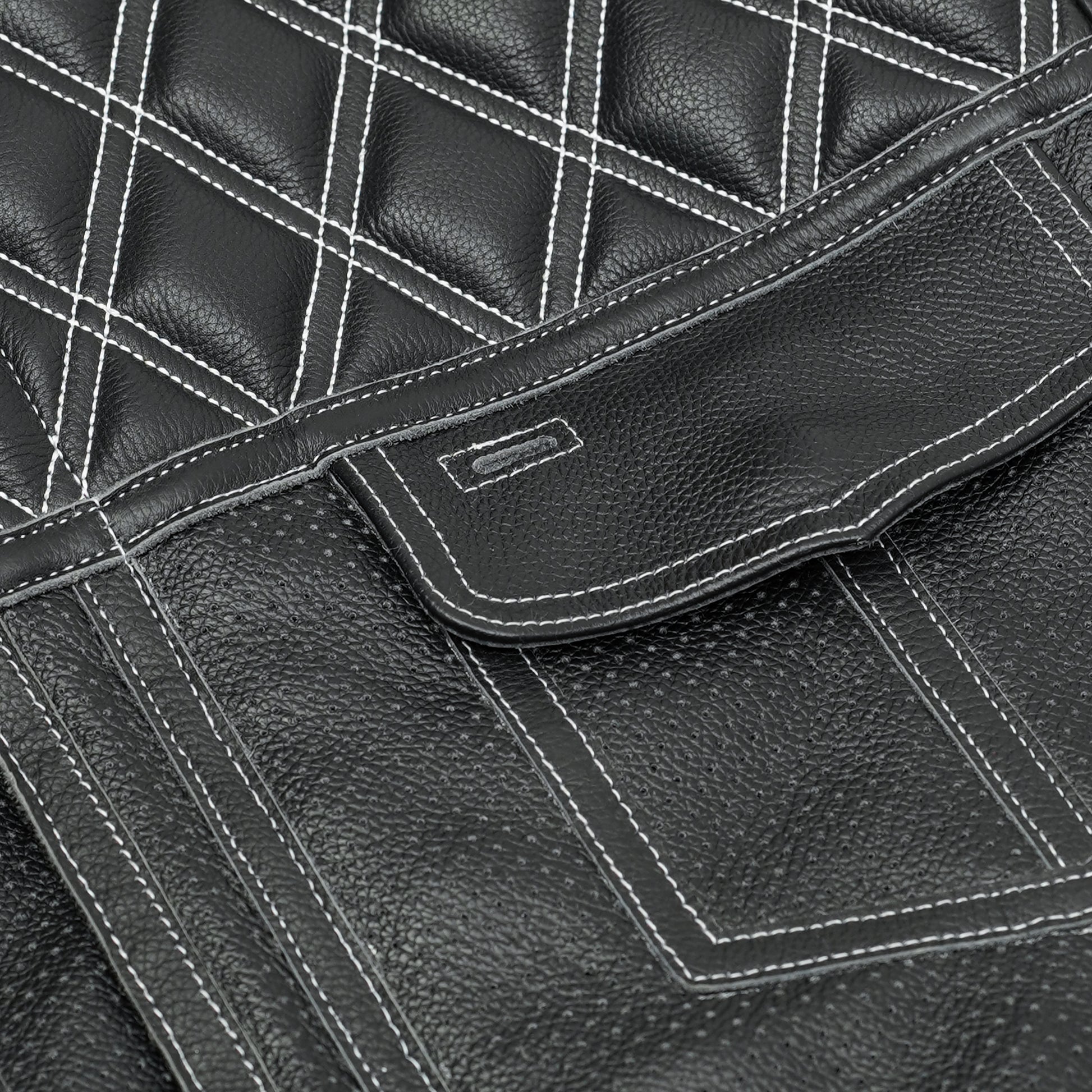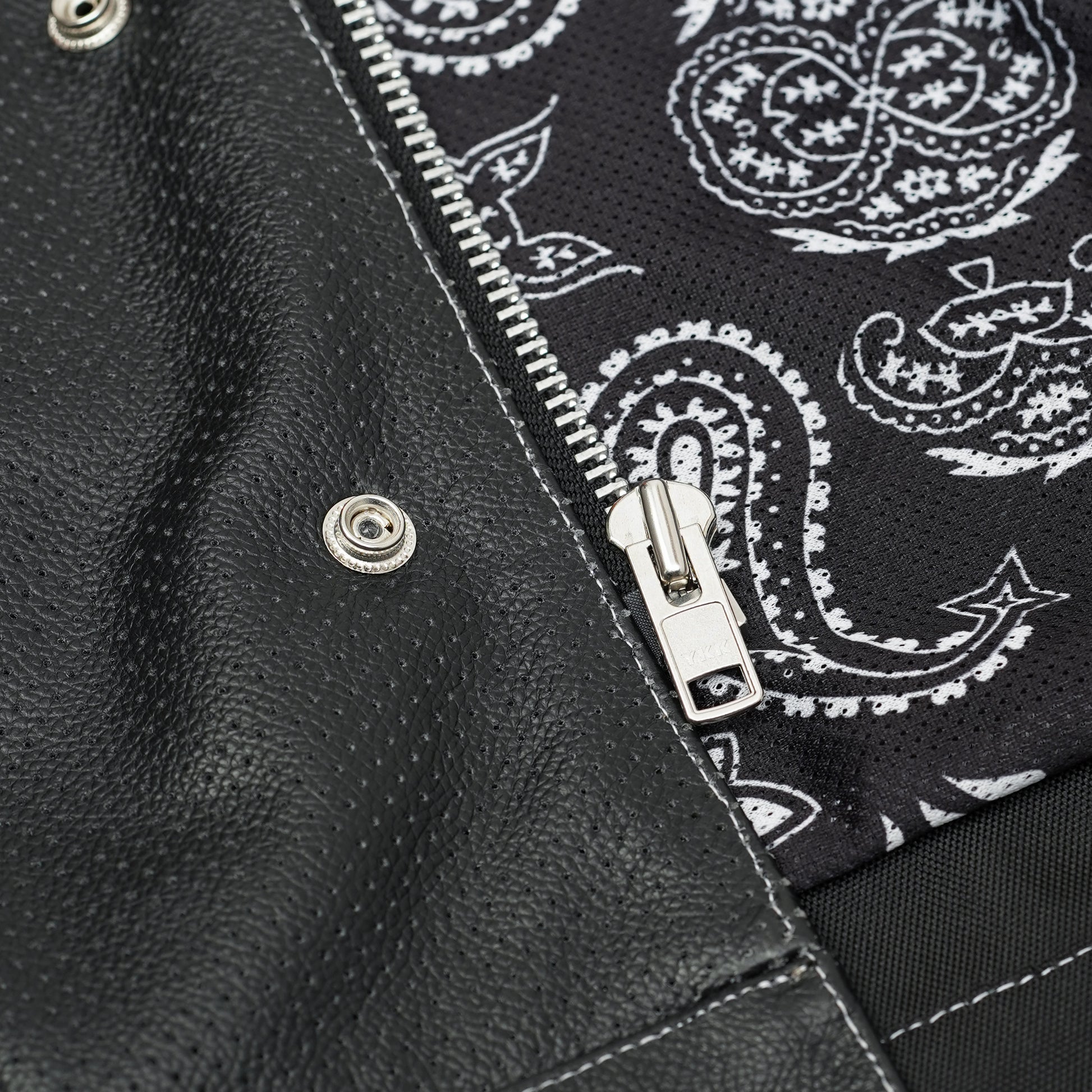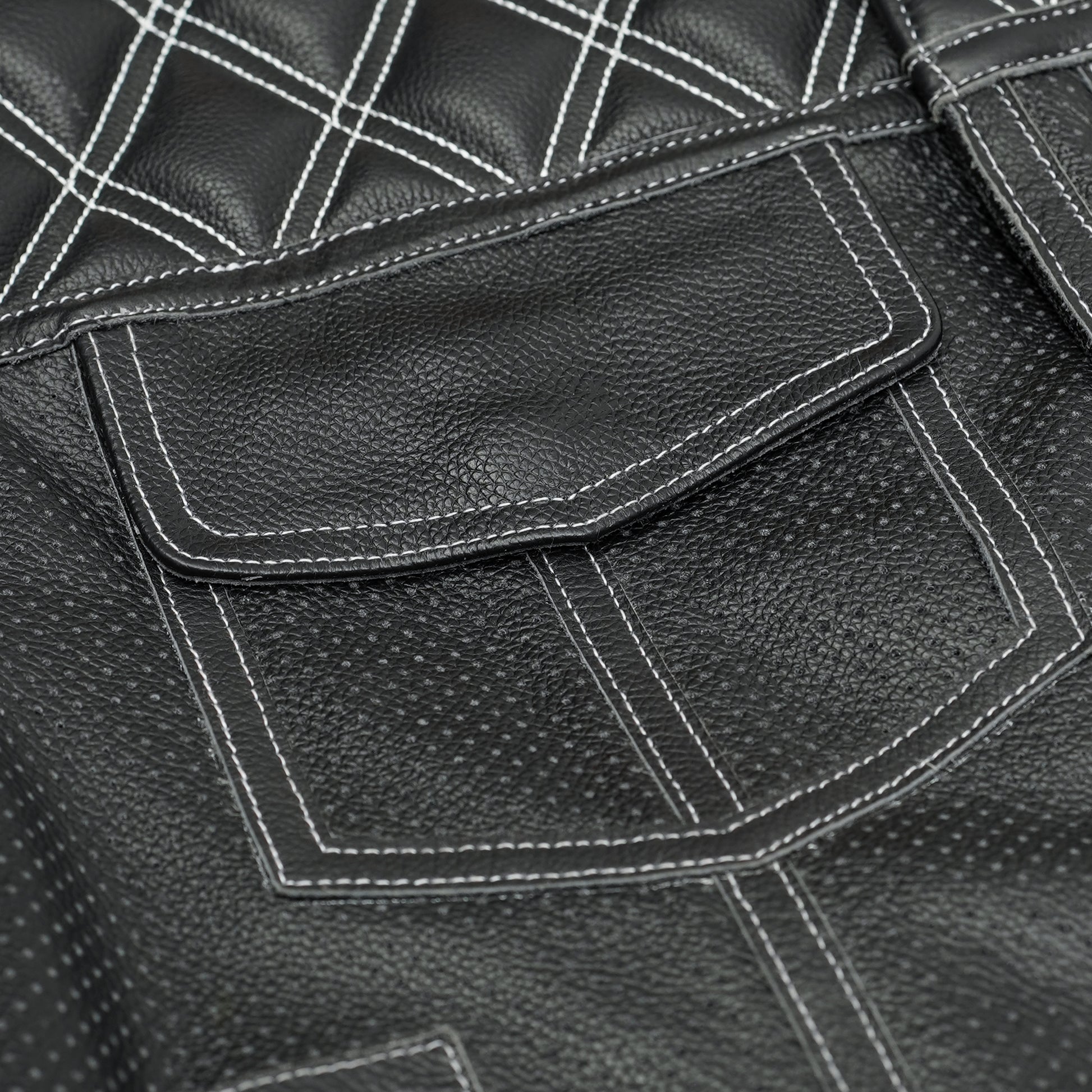 The Chrome Phantom Men's Leather Vest stands as a symbol of rugged craftsmanship and bold street style. Crafted from premium black leather, the complete outer shell offers durability with a refined, vintage edge, perfect for bikers and those who appreciate classic gear with a modern attitude. The lower front and back panels feature black perforation, ensuring improved airflow - ideal for warmer rides without sacrificing protection. Built with a single-panel back, it's ready for club patches or custom embroidery. The vest includes snap button closures on two hand pockets and two chest pockets, while the front main zipper - hidden under a snap-placket - keeps wind and rain at bay during rides. Inside, you'll find heavy-duty paisley lining for a soft yet sturdy feel, plus reinforced shoulder support. Two interior gun pockets are outfitted with black elastic holsters and double magazine holders for secure utility. Original YKK zippers and heavy thread stitching reinforce the vest's strength, offering lasting performance and classic biker appeal. Whether you're hitting the open road or just want a versatile leather vest with a sleek profile, the Chrome Phantom delivers both function and timeless attitude.