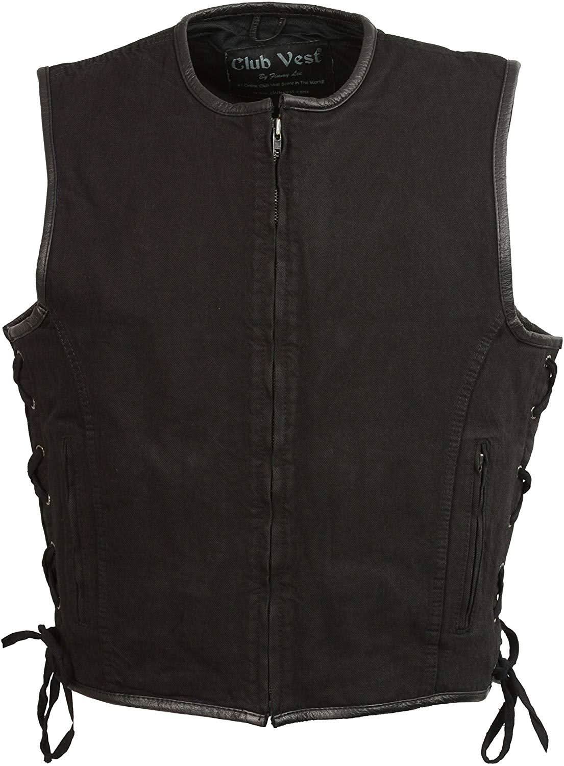Club Vest CVM3039 Men's Black Denim Motorcycle Rider Vest with Leather Trim and Side Laces