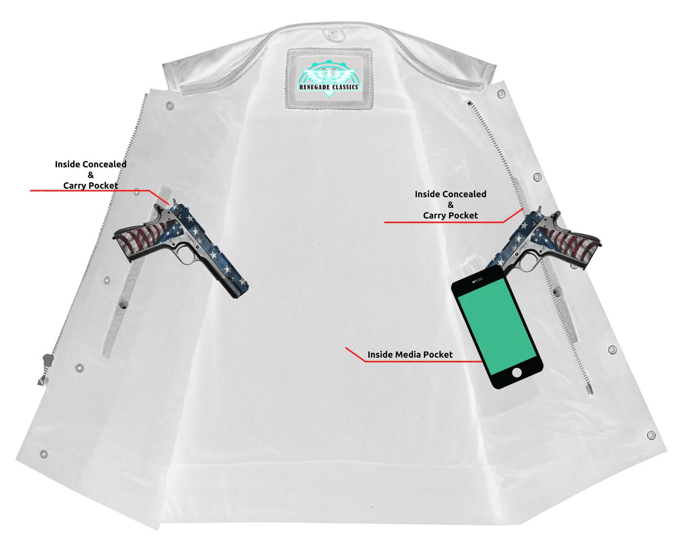 - Hidden pockets tucked between the snap and zippers, made of durable textile with built-in holsters and snap closures.
