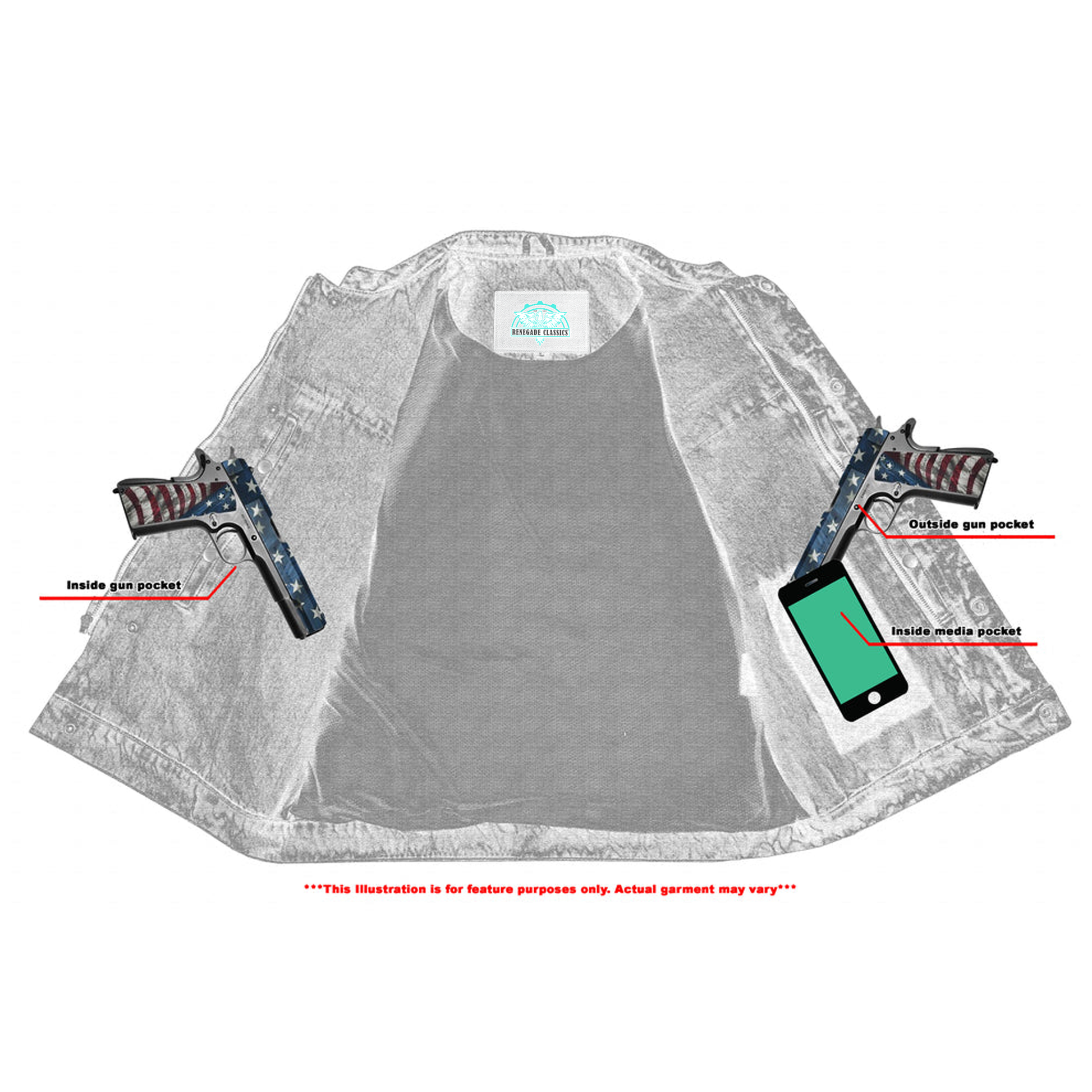 2 upgraded style concealed gun pockets between the snap and the zipper made of special heavy-duty textile with built-in holsters and snap closure.