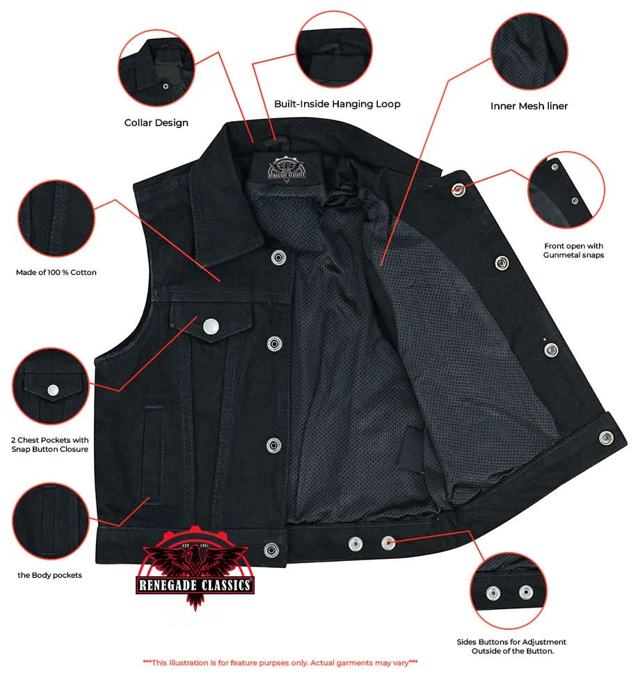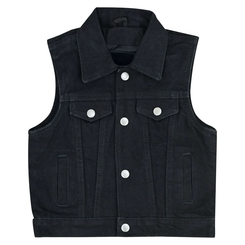 Revamp your kid's look with our kid's premium denim vest, featuring a front-open design and gunmetal snaps for effortless style. Stay organized on the move with practical pockets and enjoy a customized fit with the back snaps.