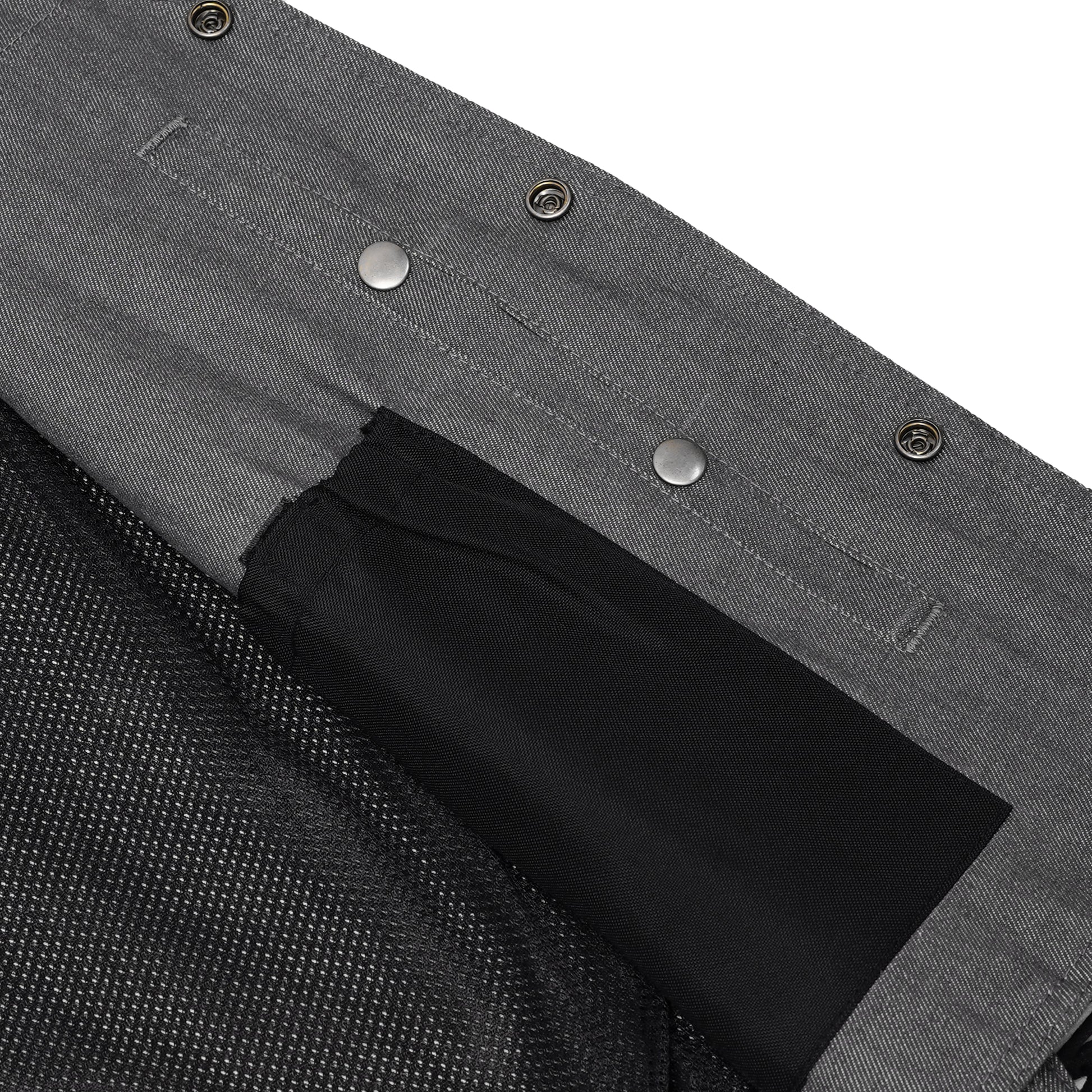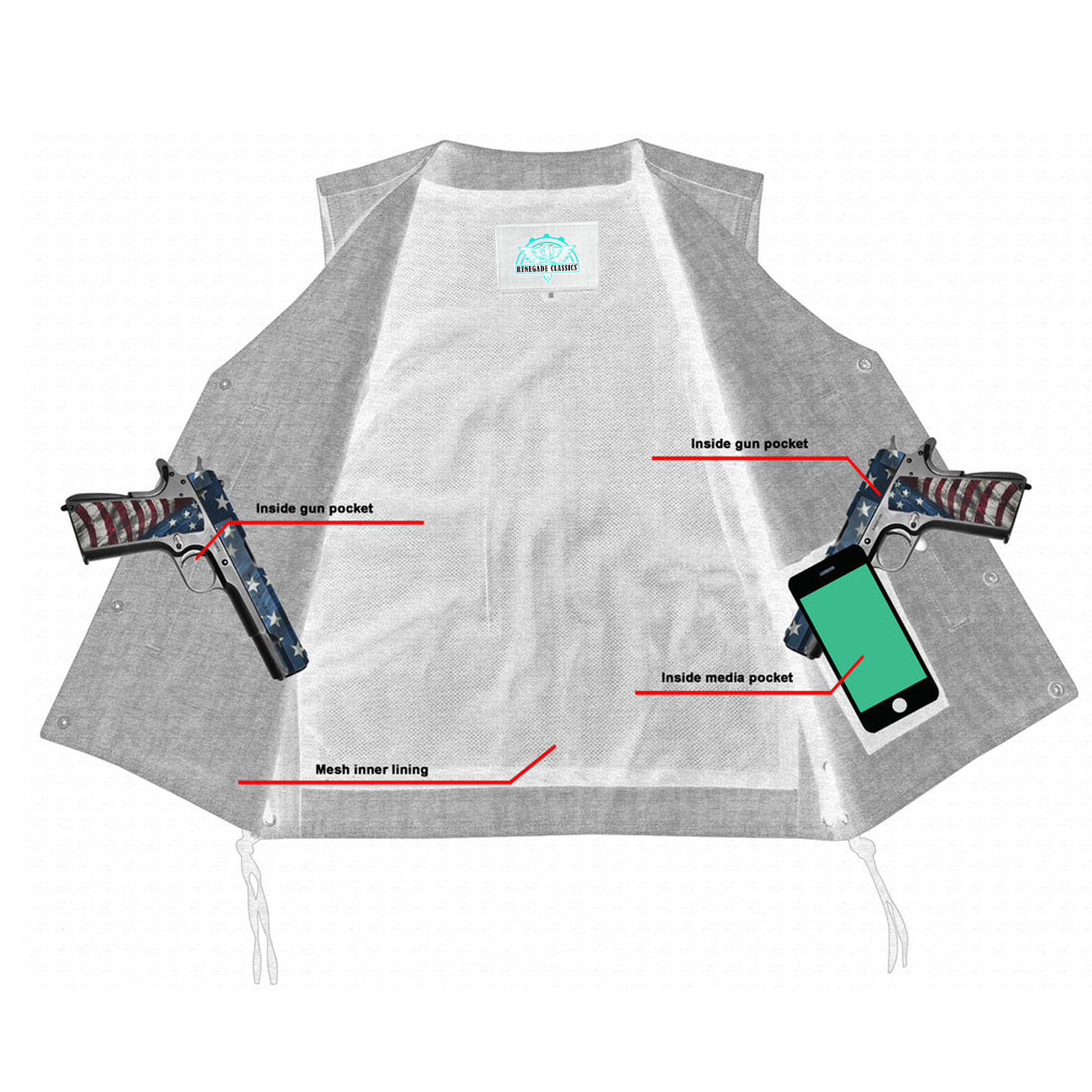 2 inside concealed gun pockets made of special heavy-duty textile with built-in holsters and snap closure.