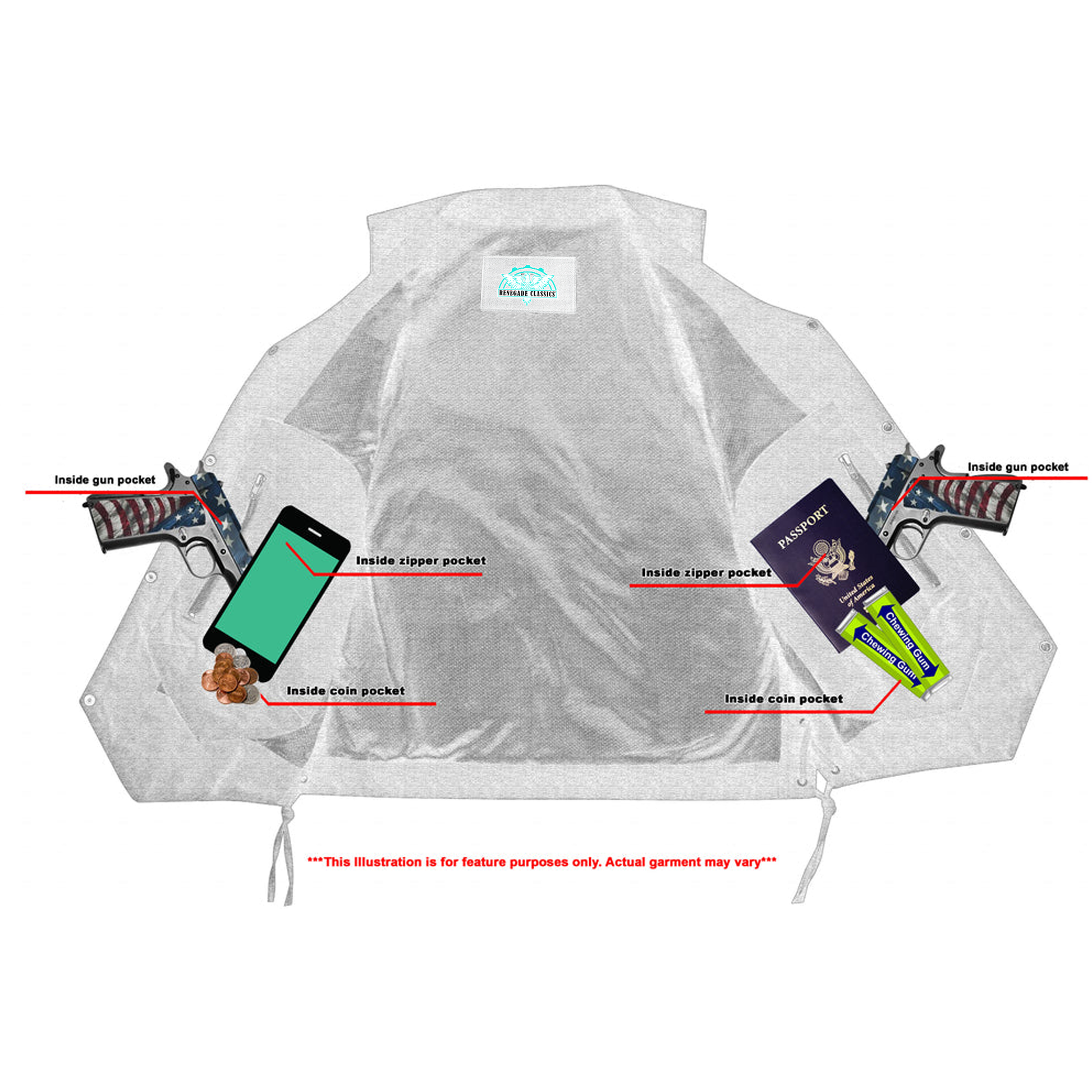 Built in dual side concealed gun pockets with built-in holsters and snap closure.