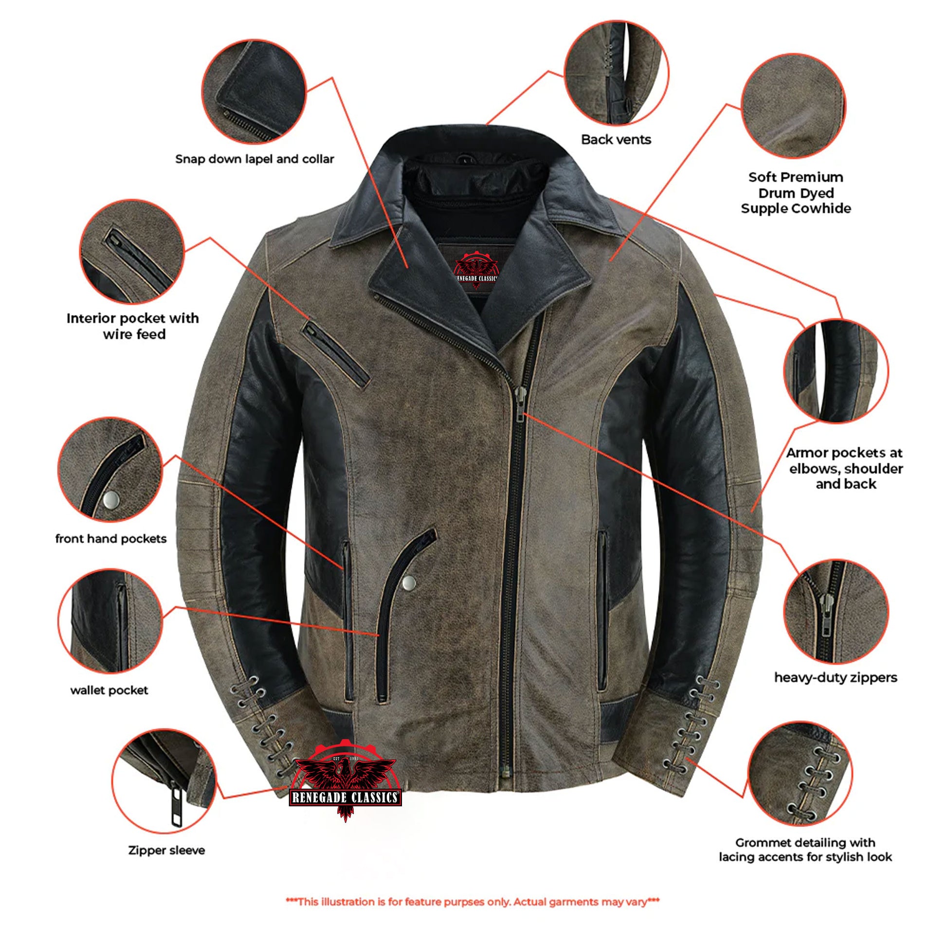 It has two front-hand pockets, one wallet pocket, and an inside pocket with a wire feed. With a modern fit, belted tabs, and reinforced shoulder support, it provides both comfort and secure storage. The zip-away heated liner, armor pockets, and heavy-duty zippers round off the design. The Fusion Flow Women's Leather Jacket blends edgy style with all-season comfort. With lacing accents and vented airflow, its built for bold, fearless rides. Ride strong, stay stylish, and embrace the adventure!