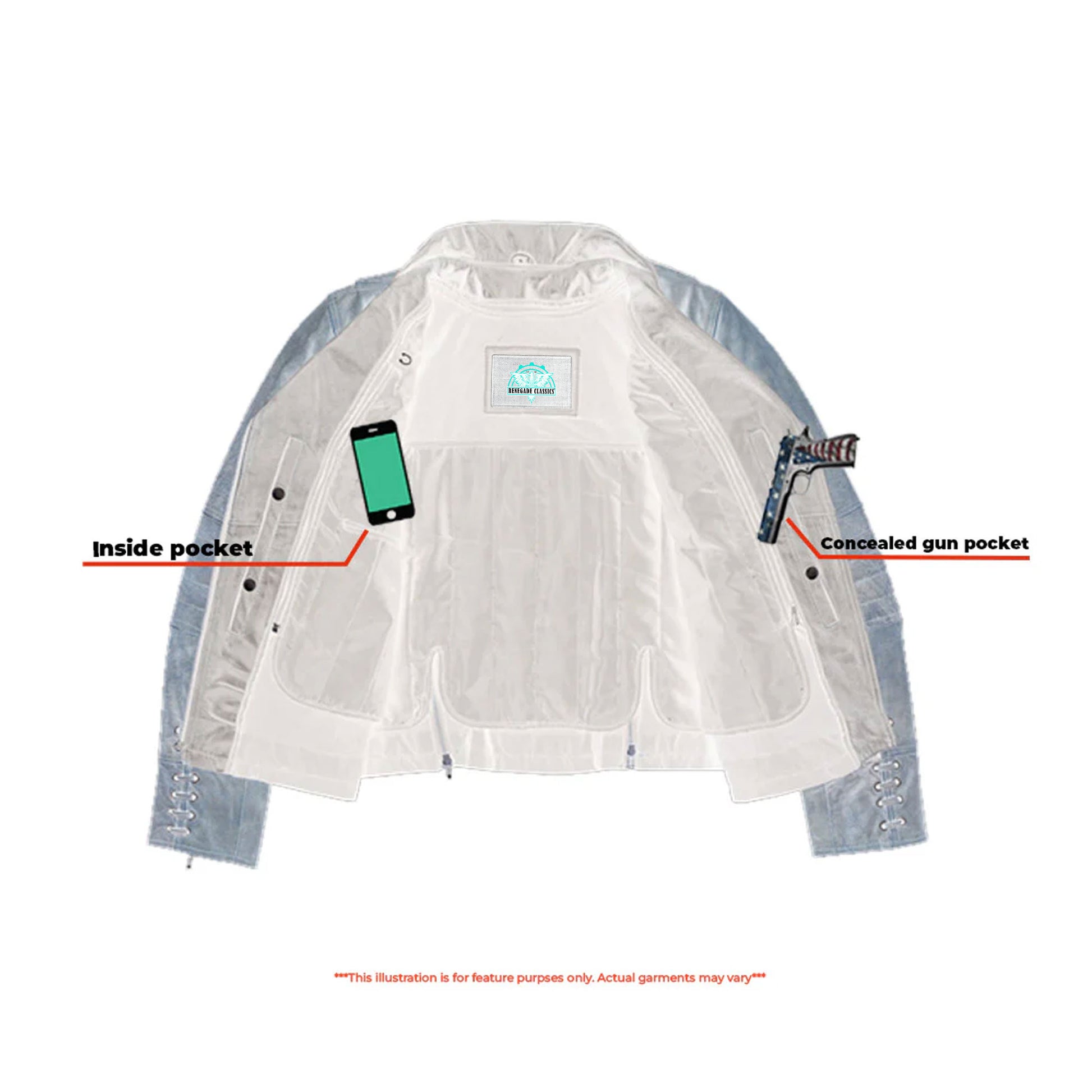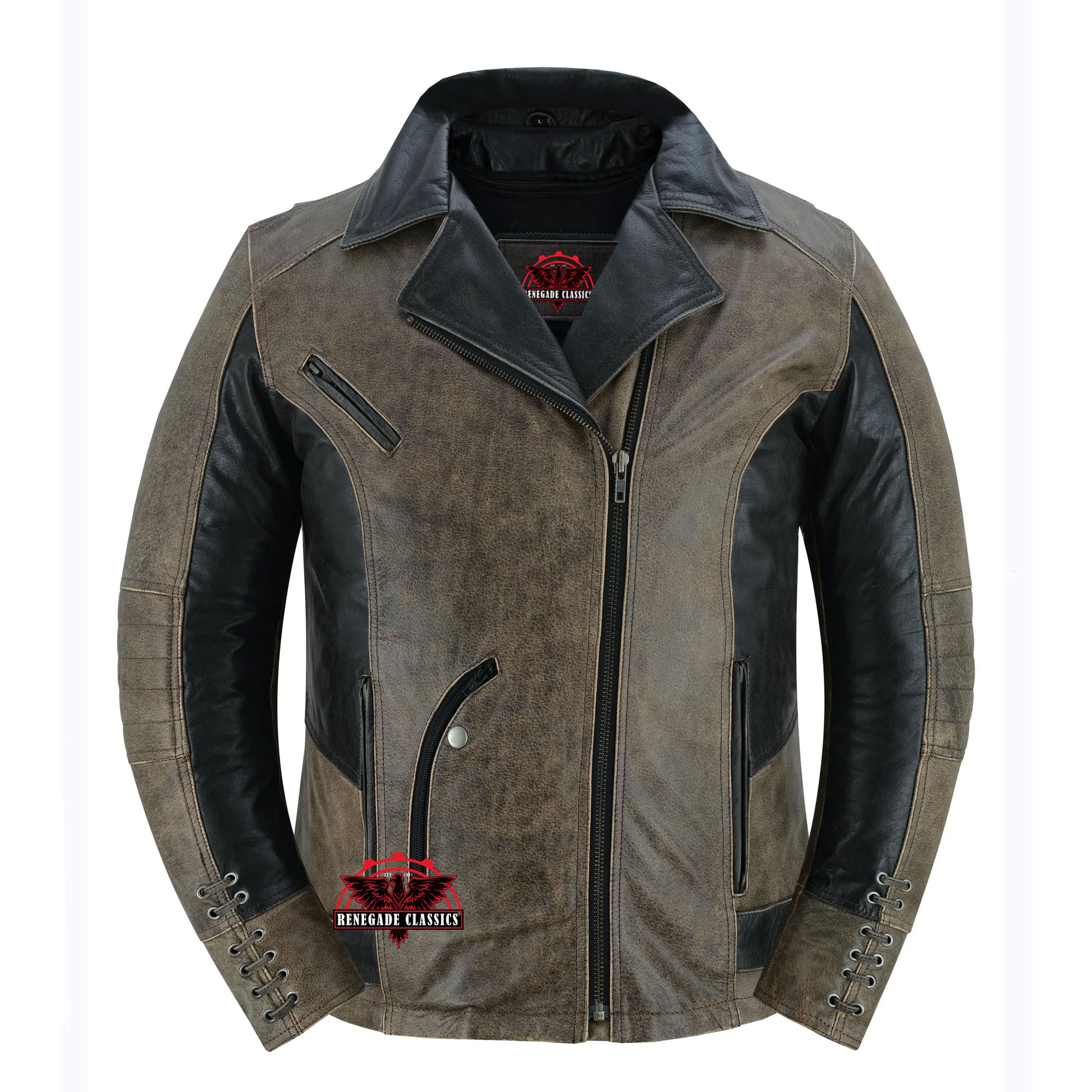 The Fusion Flow Women's Leather Jacket is made of soft superior drum dyed supple cowhide 1.1-1.2 mm. It features stylish grommet and the detailing of lacing accents and a snap-down lapel and collar add to the charm. A vented zipper chest pocket and two back vents promote airflow, allowing you to breathe comfortably regardless of the season.