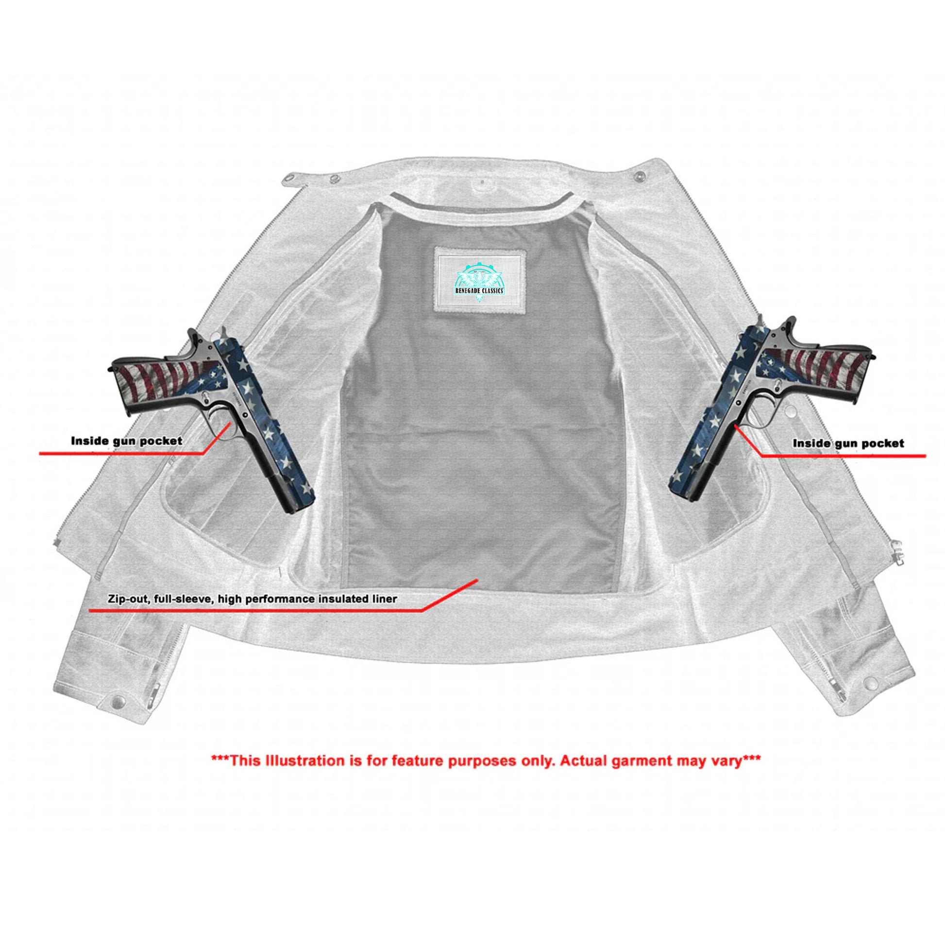 2 inside concealed Smart Access Pocket made of special heavy-duty textile with built-in holsters and snap closure.