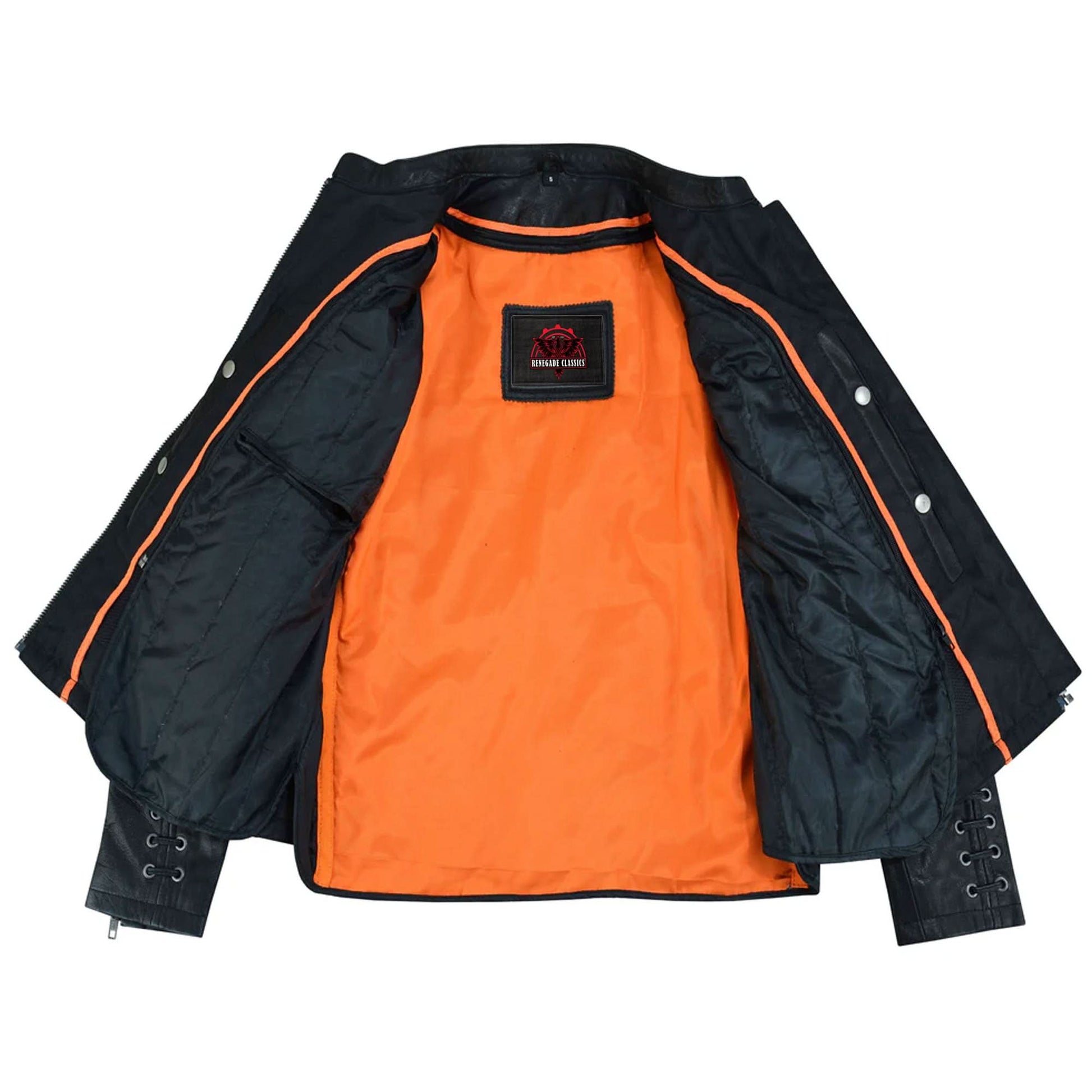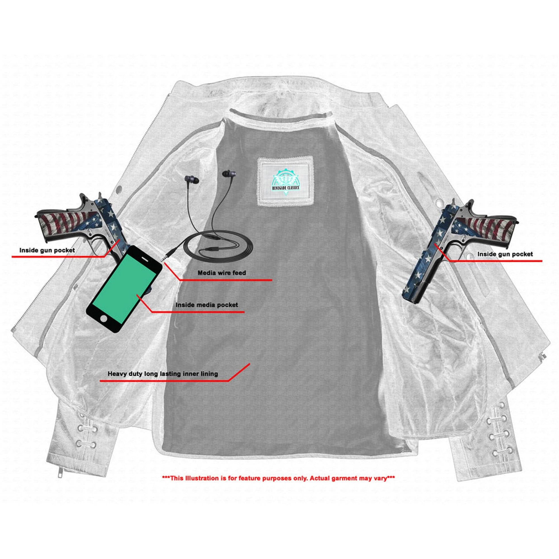 2 inside concealed gun pockets made of special heavy duty textile with built-in holsters and snap closure.