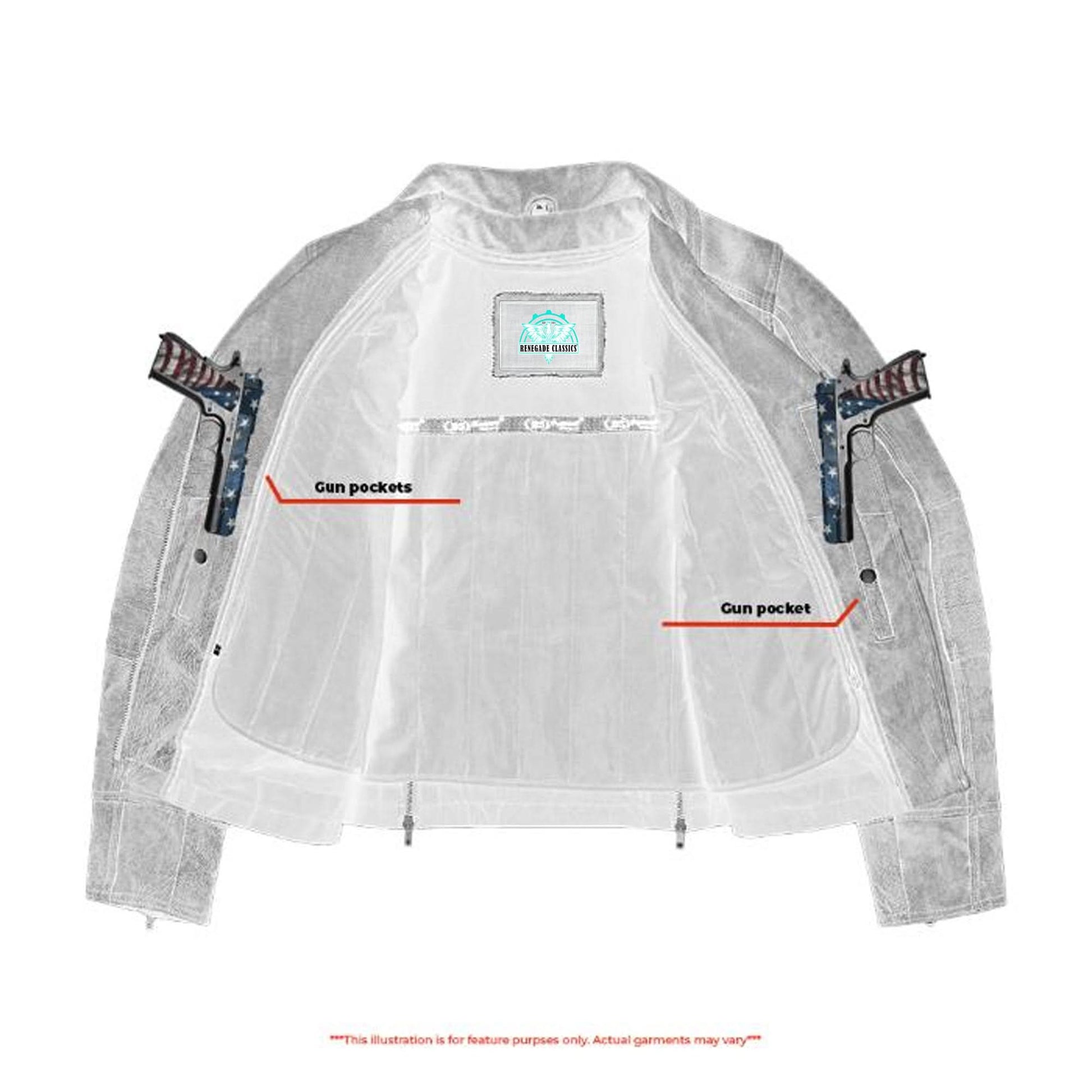 - 2 inside concealed gun pockets made of special heavy duty textile with built-in holsters and snap closure.