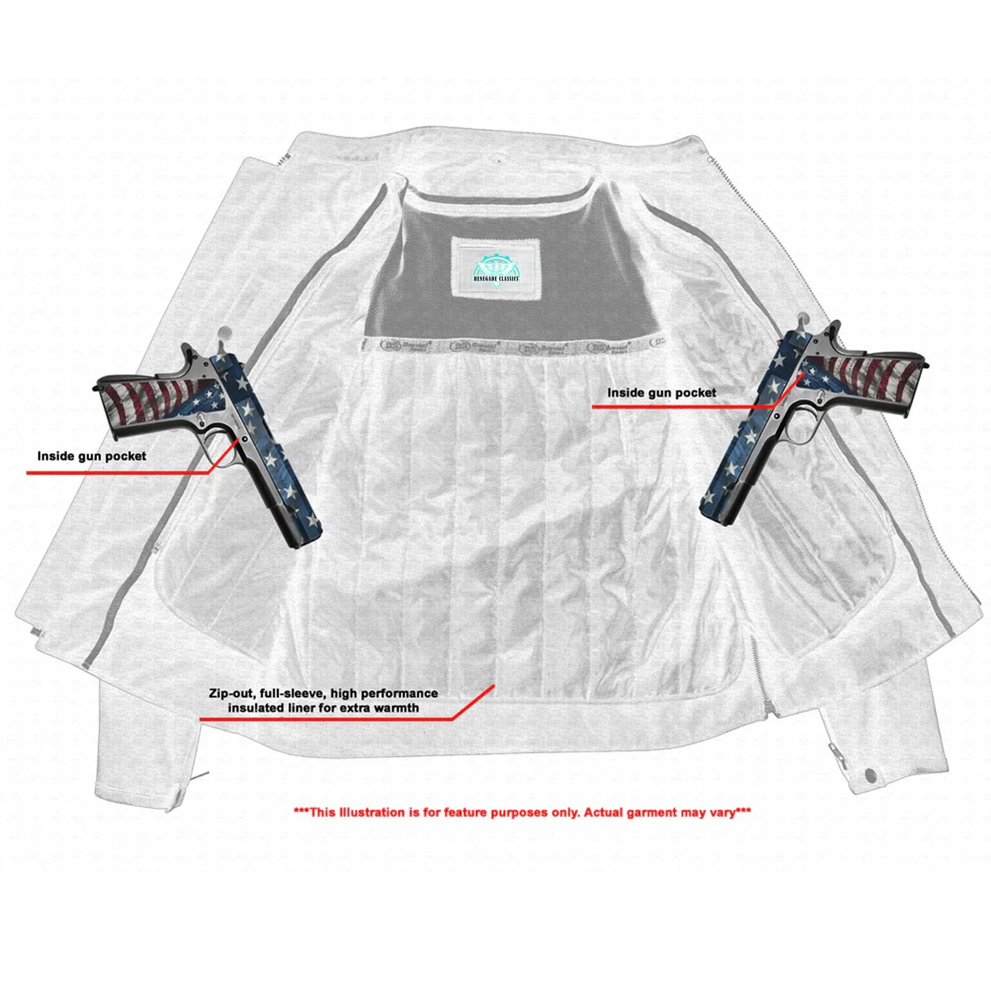 - Two hidden pockets made of heavy-duty textile with built-in holsters and snap closures.