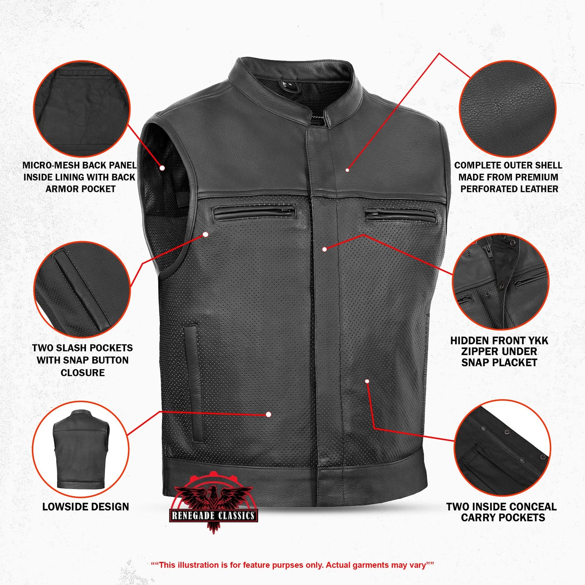 Meet the Gravel Ghost Leather Vest by Renegade Classics. It’s made for riders who live the road. Crafted from premium perforated leather, it keeps you cool and comfortable on long rides. The low-side design gives it a clean, refined look.