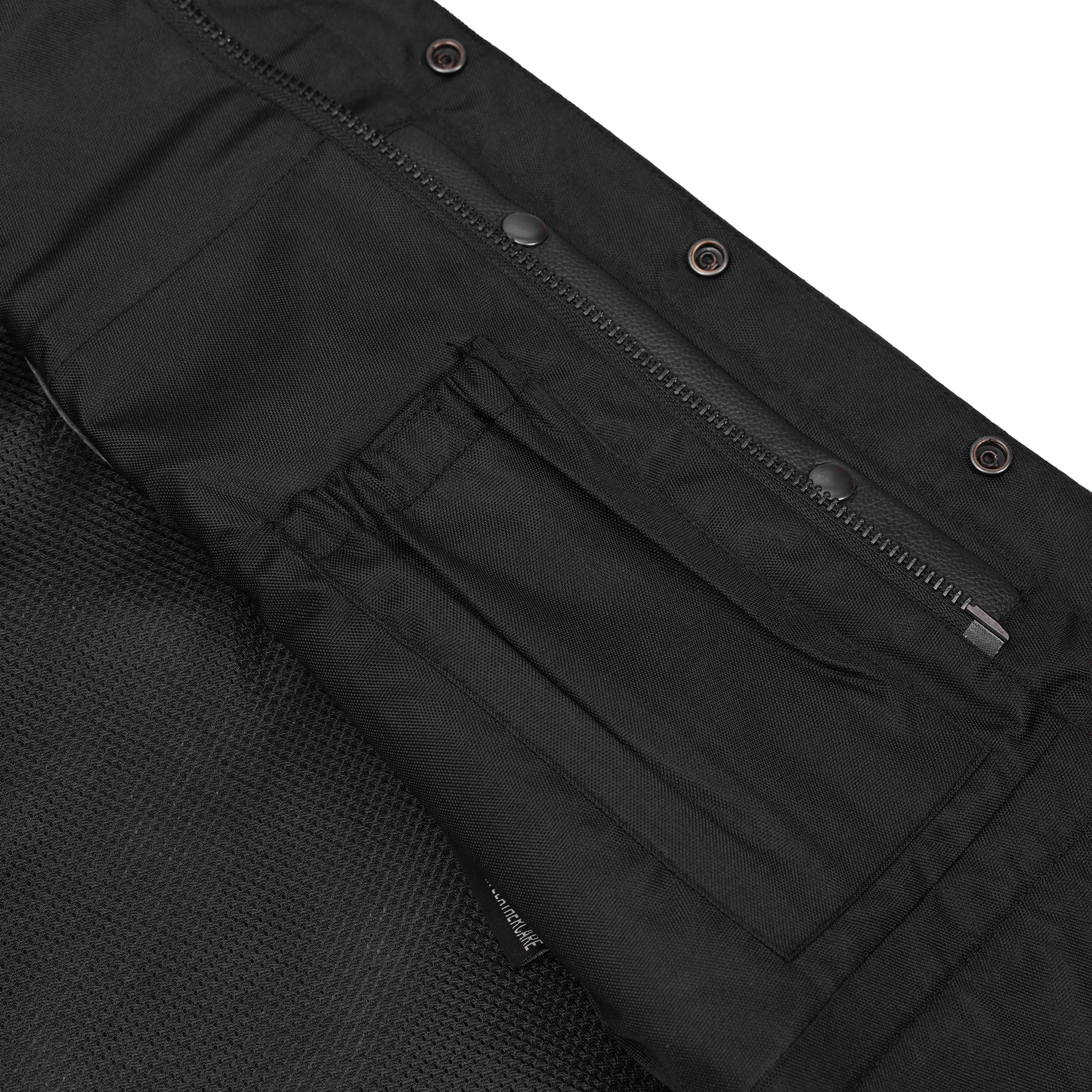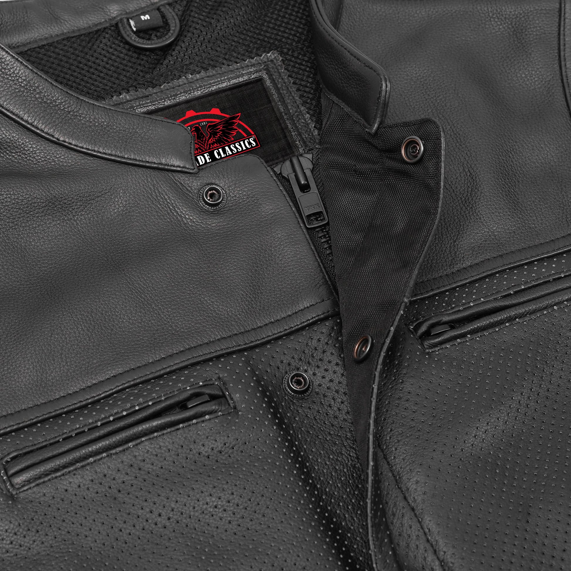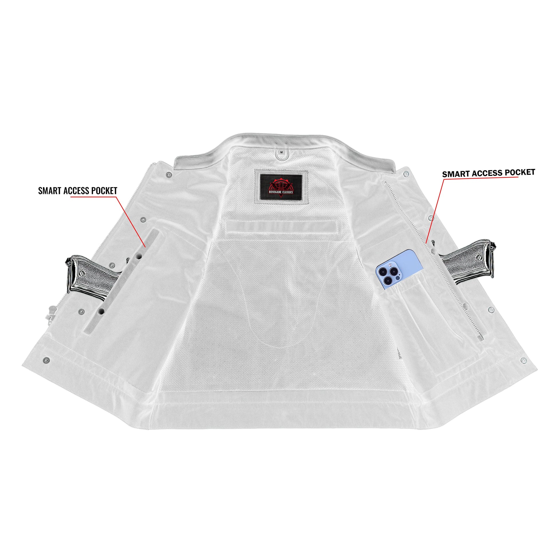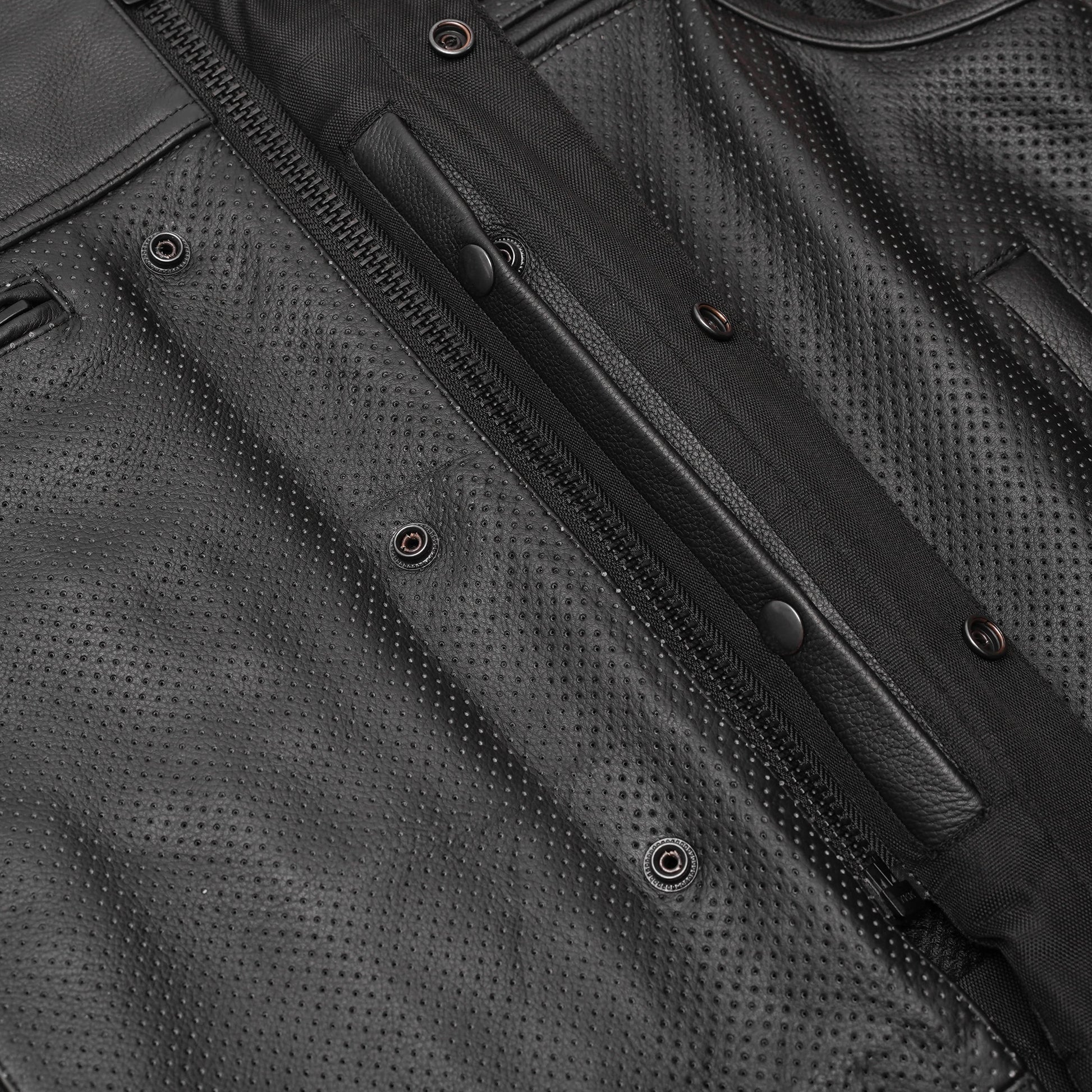It features a micro-mesh back panel for airflow and a back armor pocket for extra protection. The hidden front YKK zipper with a snap placket provides a sleek finish. With two front slash pockets and two inside concealed carry pockets, it’s both practical and protective.