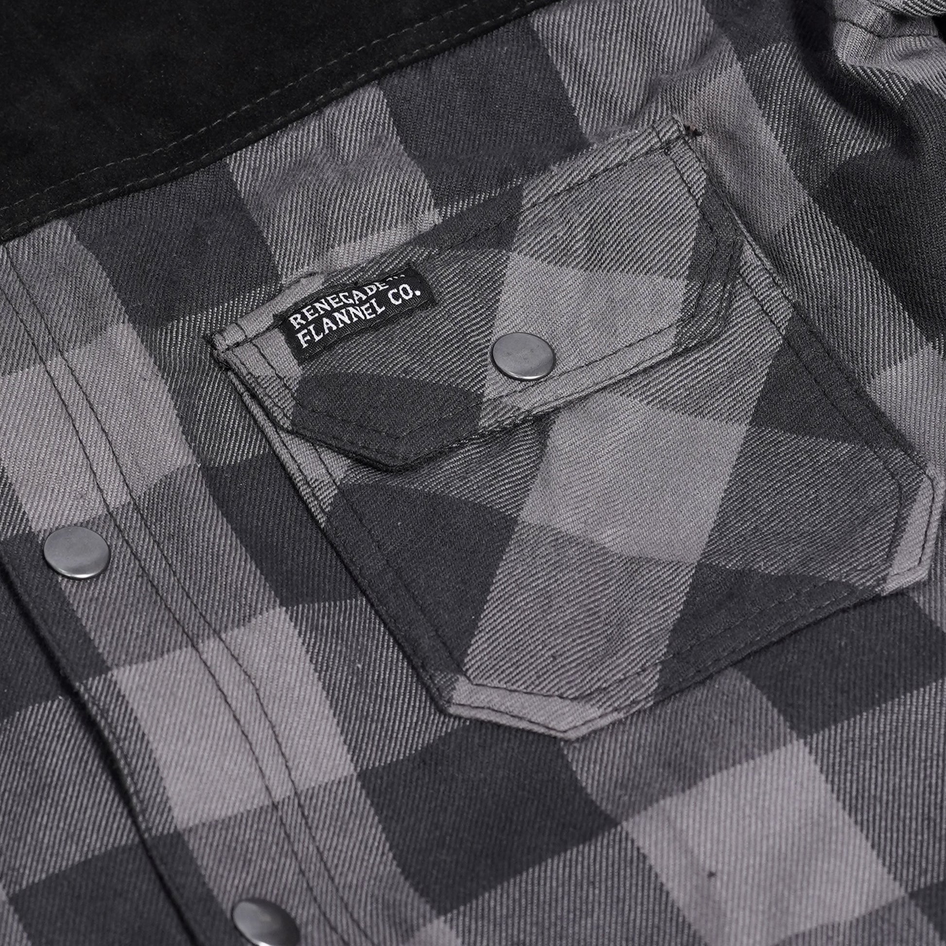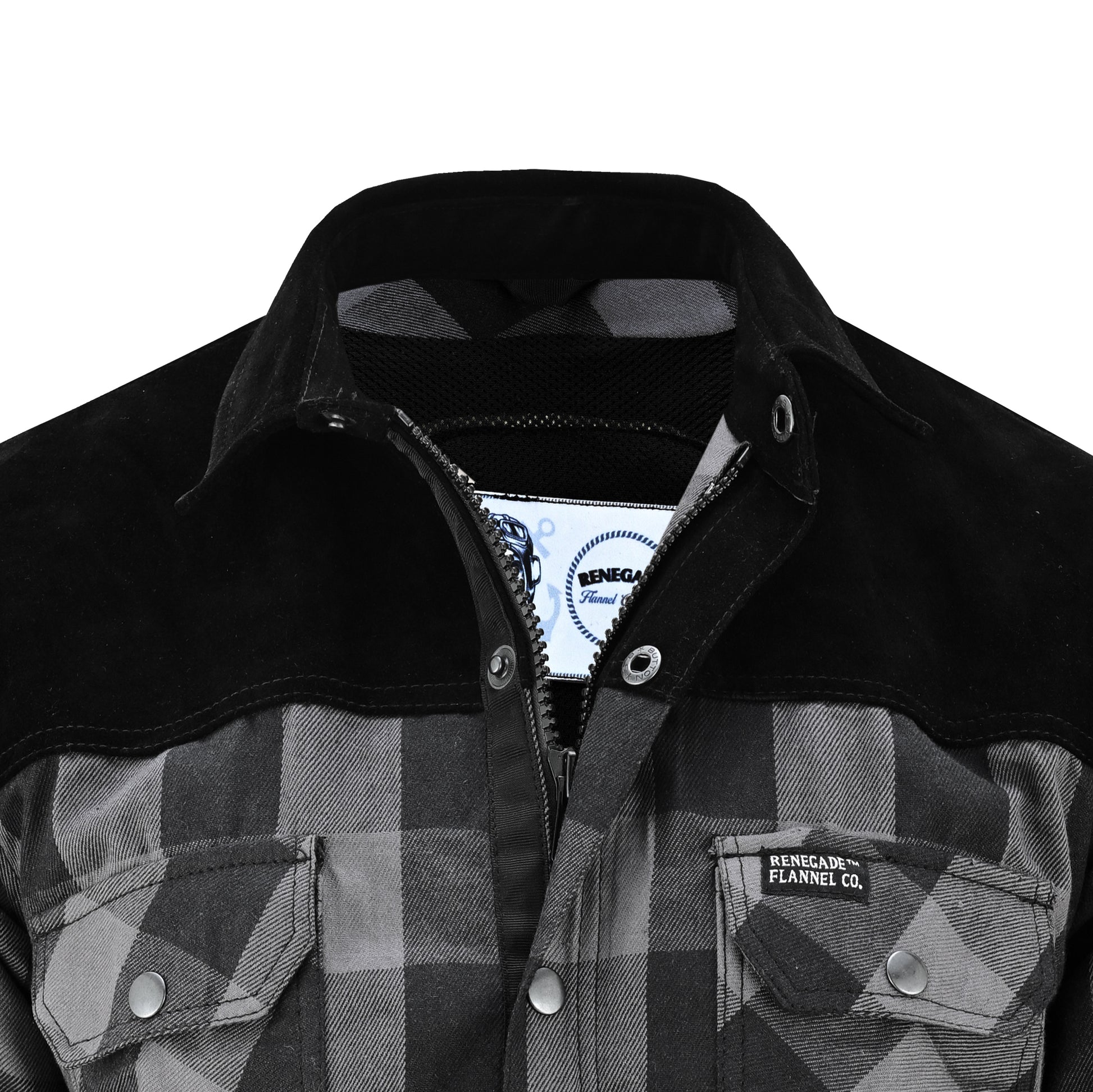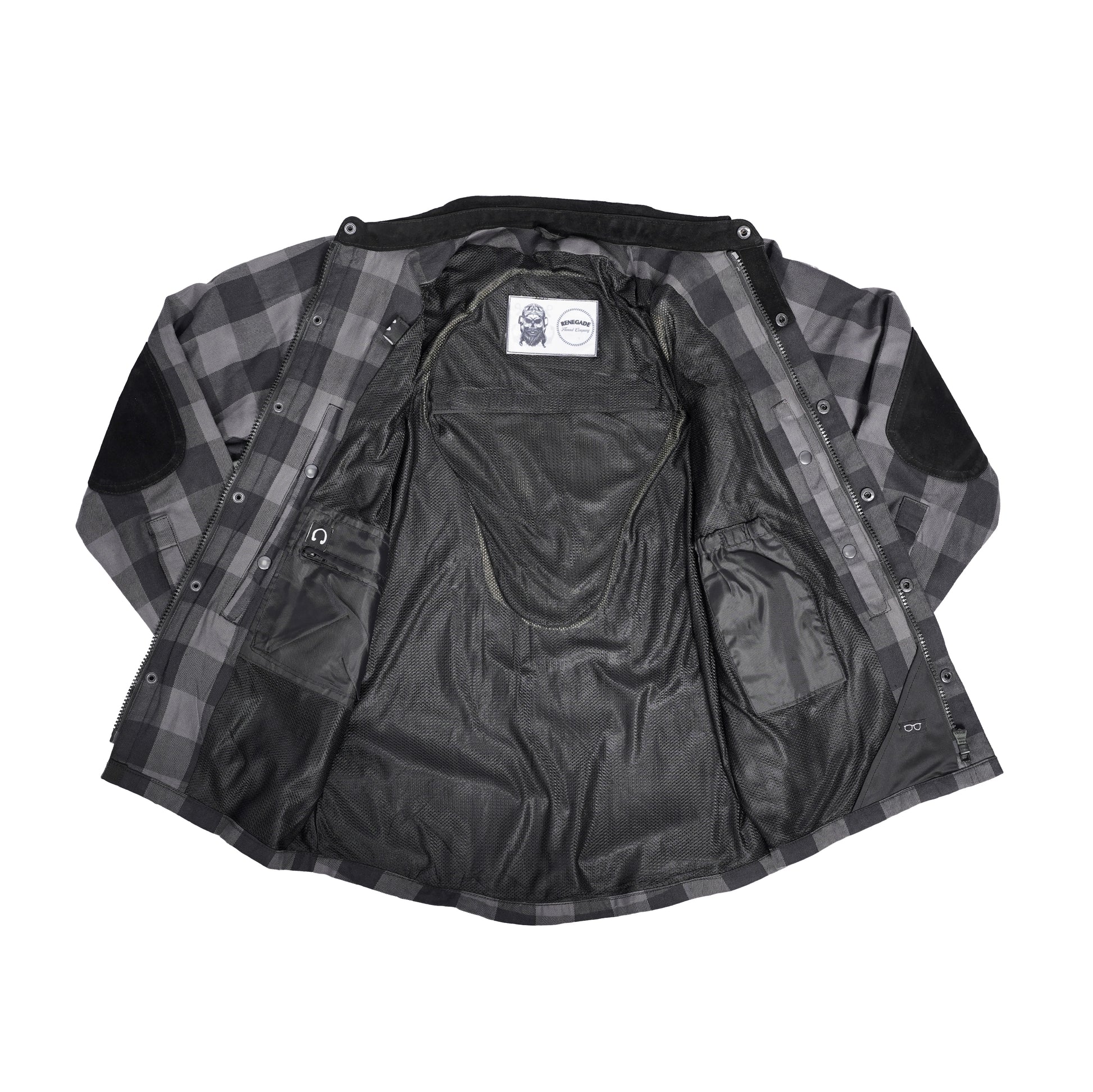 This black and gray flannel shirt delivers a classic, rugged look with neutral tones and leather patches, giving it a timeless yet edgy appeal. The feel is soft and breathable, thanks to the durable cotton flannel and micro-mesh inner lining, making it comfortable for everyday wear or extended rides. The design balances utility and style, providing easy access pockets and flexibility for movement, so you’re ready for whatever the road throws your way.