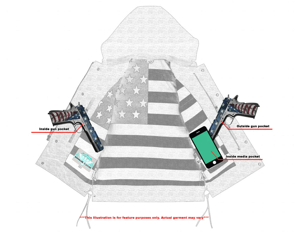 2 upgraded style concealed gun pockets between the snap and the zipper made of special heavy-duty textile with built-in holsters and snap closure.