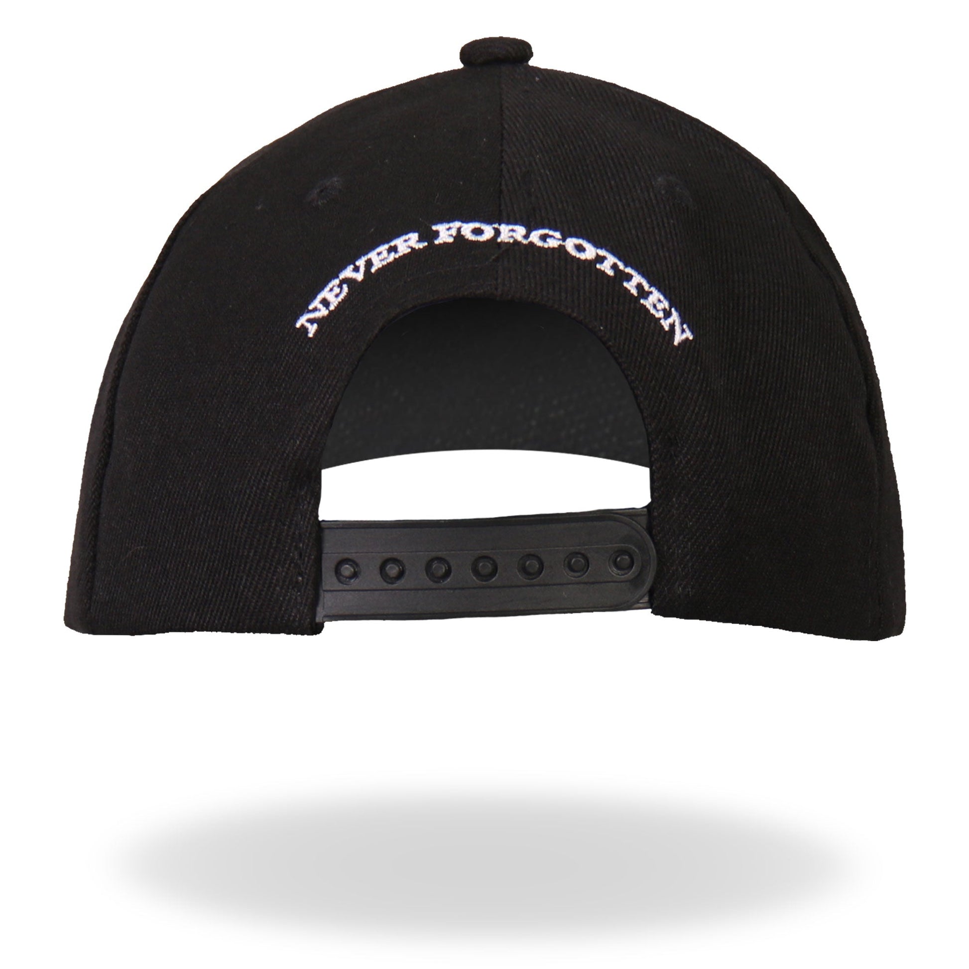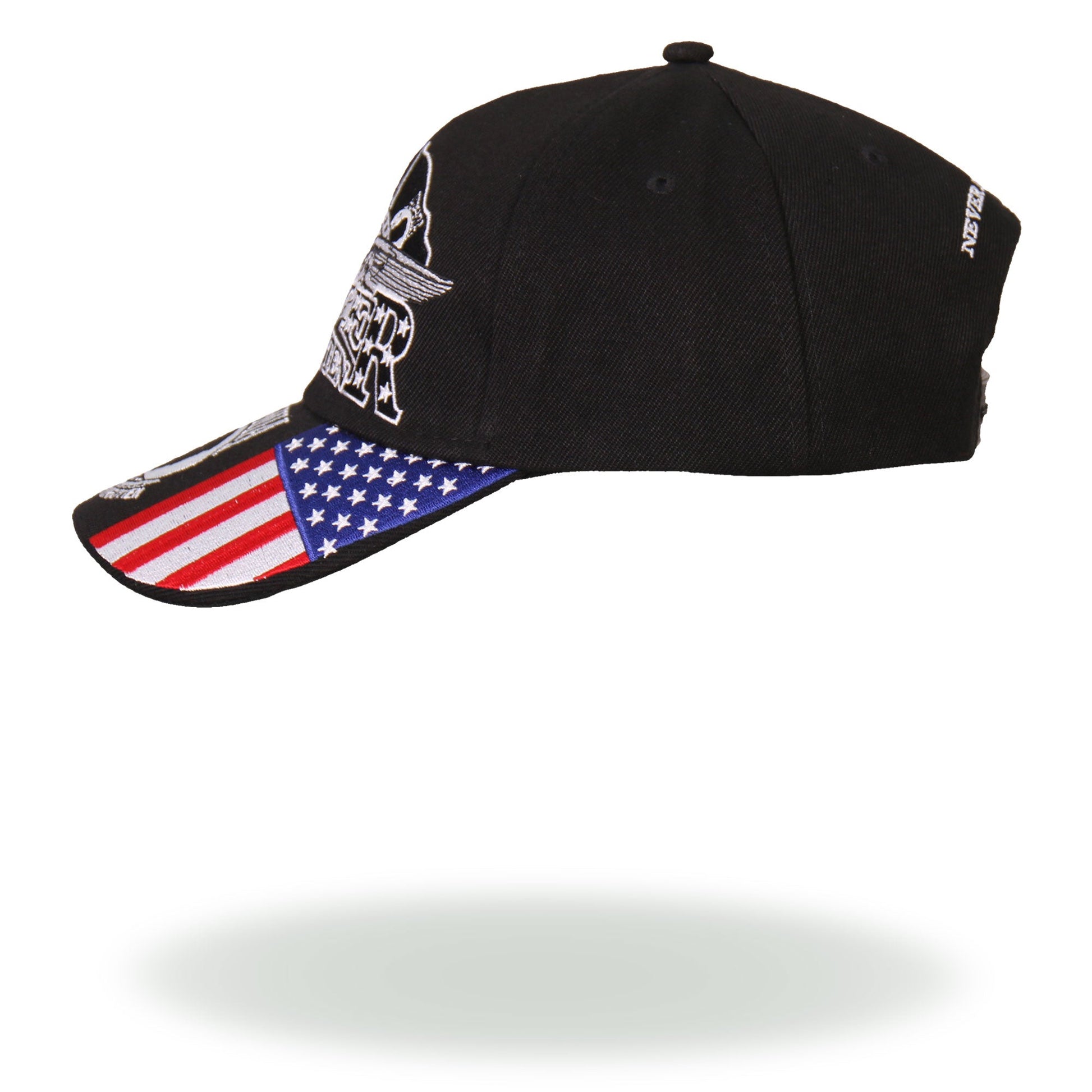 Our signature Iron Eagle POW Ball Cap features an original design on a black cap. The phrase "NEVER FORGOTTEN" is embroidered in white in the center of the cap underneath a bald eagle, crown of stars, American flag, and POW/MIA flag. The bill of the cap has American flags on either side and the POW/MIA emblem in the center, which features the phrase "YOU ARE NOT FORGOTTEN." Wear this ball cap to add patriotism to your biker style.