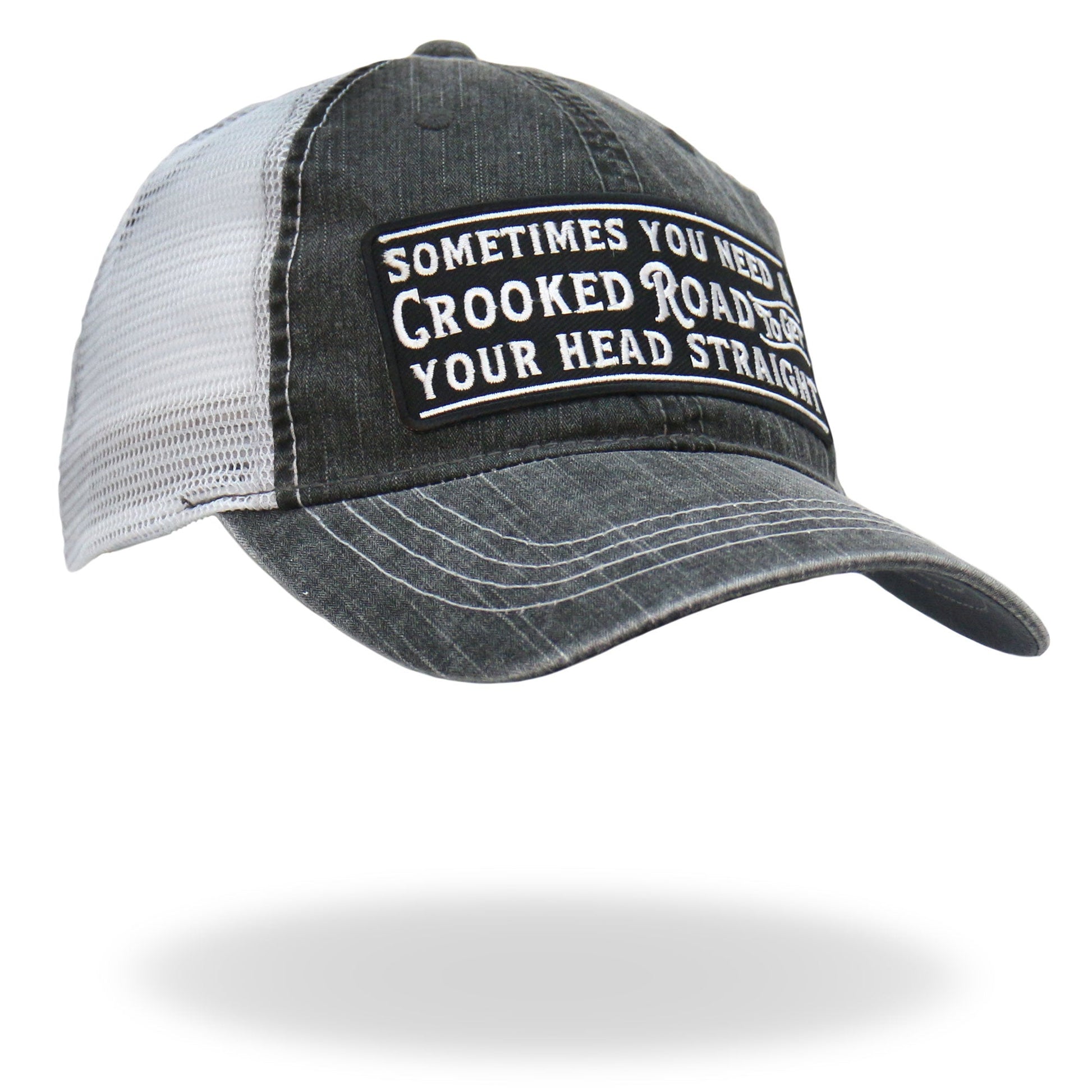 This hat features a black and white patch reading "Sometimes you need a crooked road to get your head straight".