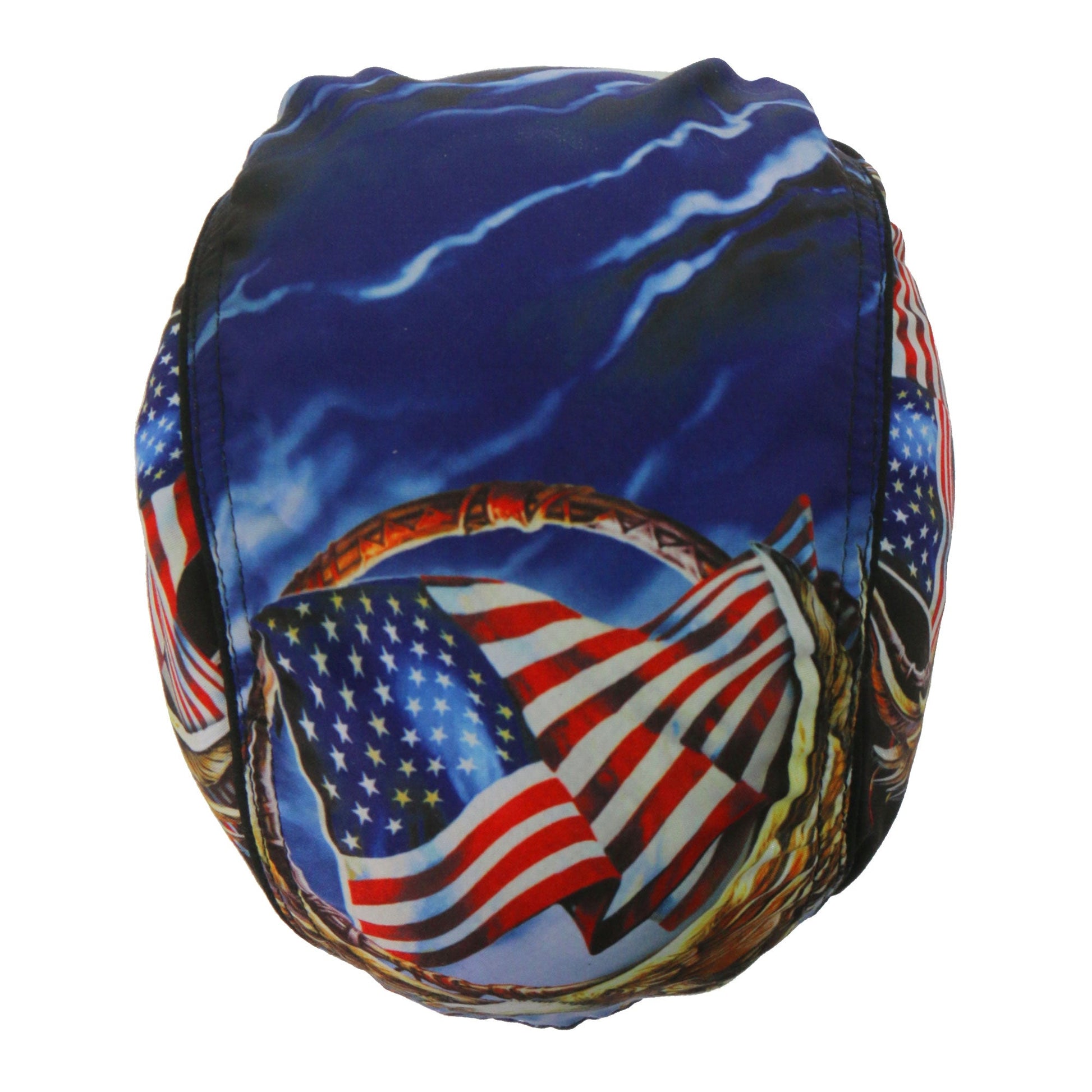 Whether you're hitting the road for a joyride on your motorcycle, getting together with your club, or just need some UV protection and sweat control, Hot Leathers premium doo rag head wraps are just what you need! Put on your new headwrap bandana while you run errands or handle some yard work. Represent your unique style with our moisture wicking, mesh lined head wraps, showcasing bright, long lasting designs sure to turn heads! This head wrap features our original red, white and blue American flag and eagle design.