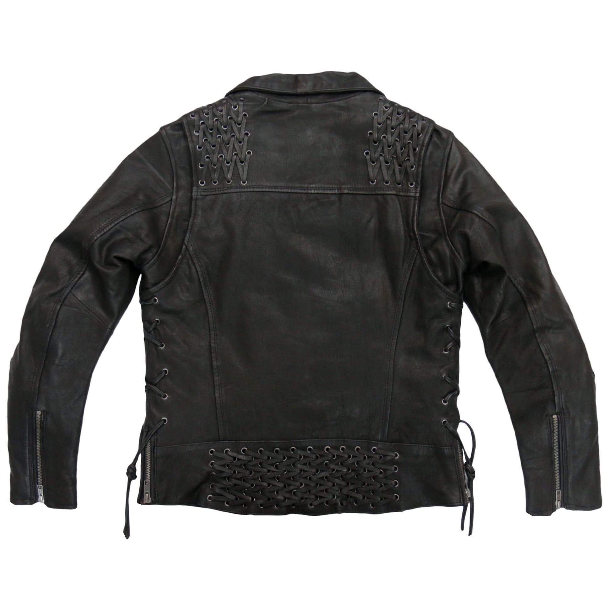 Get ready to meet your favorite new leather riding jacket.  This Hot Leathers motorcycle jacket is built using super soft medium weight cowhide & features antique silver YKK zippers and snaps. The jacket also comes with front sleeve and back vents; a great feature when you need that quick cool down while riding. This leather jacket has great rawhide lace detail on the shoulders, upper and lower back. It also features two front zipper pockets, a fold down snap collar, two carry conceal inside pockets, lace up sides & a zip out quilted lining.