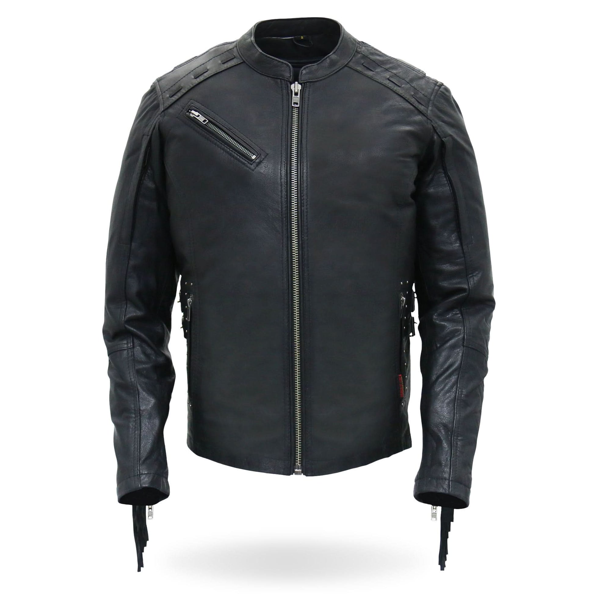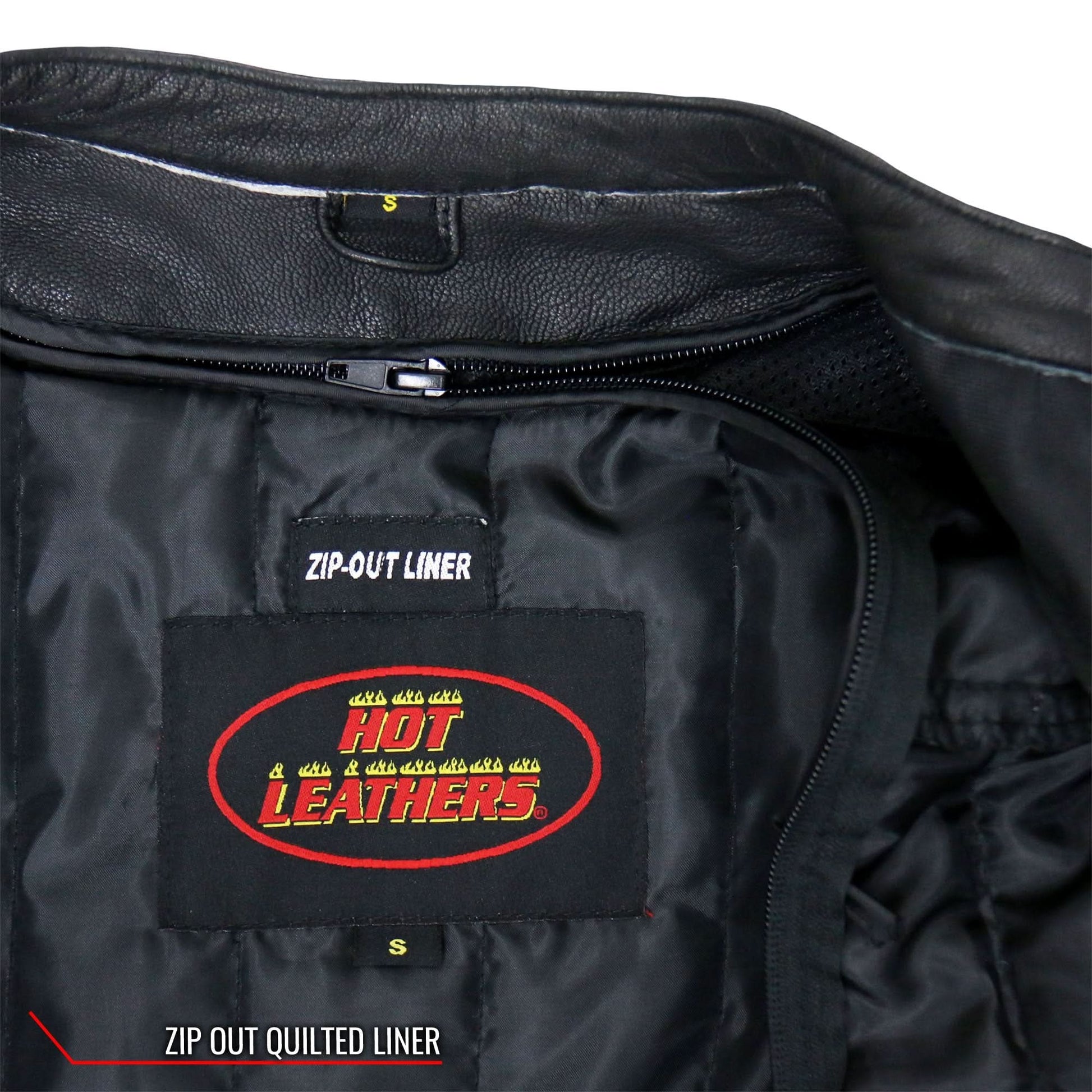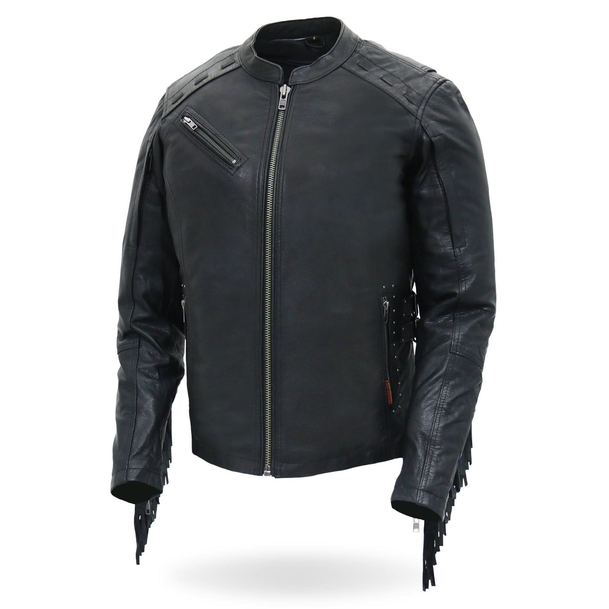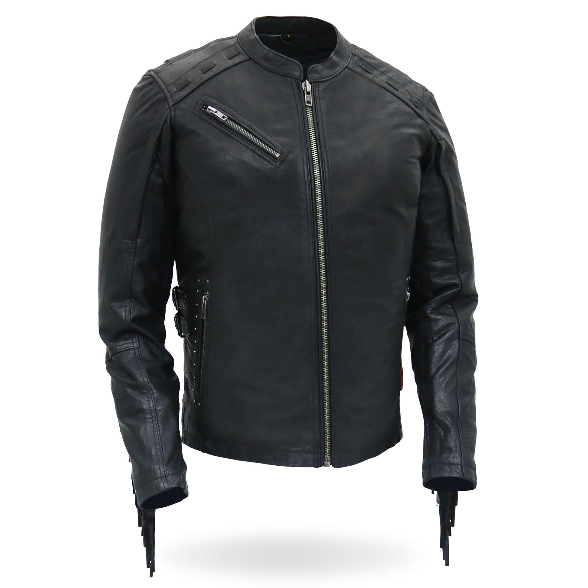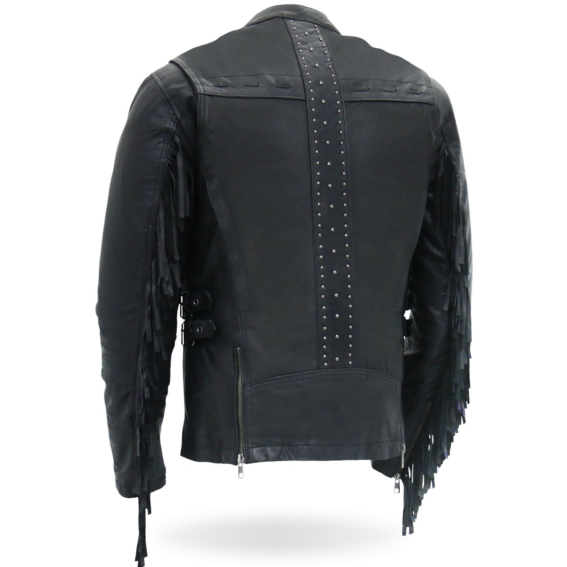 You asked for leather fringe and we listened. This all new Hot Leathers fringe motorcycle jacket is built using super soft medium weight cowhide and features silver YKK zippers and snaps. This jacket also comes with two under arm and two back vents, a great feature when you need that quick cool down while riding. The leather fringe on this jacket is the real standout feature and very eye catching. Another great detail is the triple row of silver studs going down the back.  It also features two front zipper pockets, scooter style collar, two carry conceal inside pockets, adjustable buckle sides and a zip out quilted lining. A great new feature is lower back zipper panels, unzip these when on those long rides for more comfort.