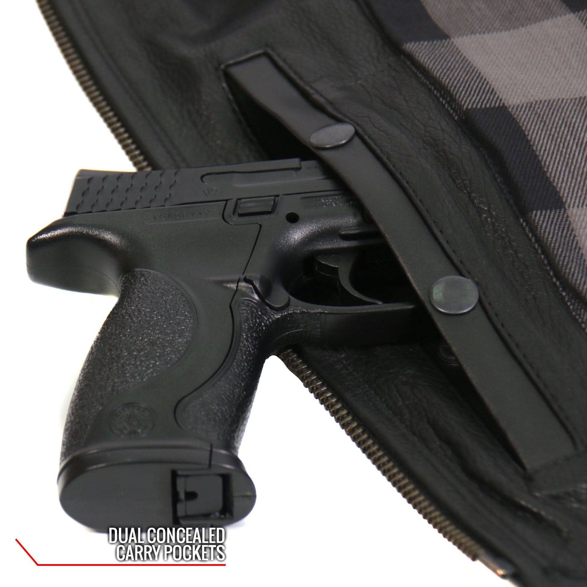 - Antiqued Silver Hardware, 2 Outside Zip Pockets , Dual Inside concealed carry pockets and one Snap Closure pocket for additional storage