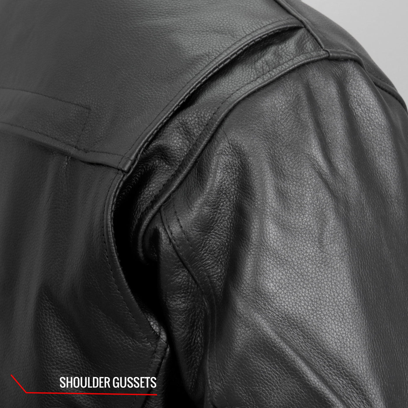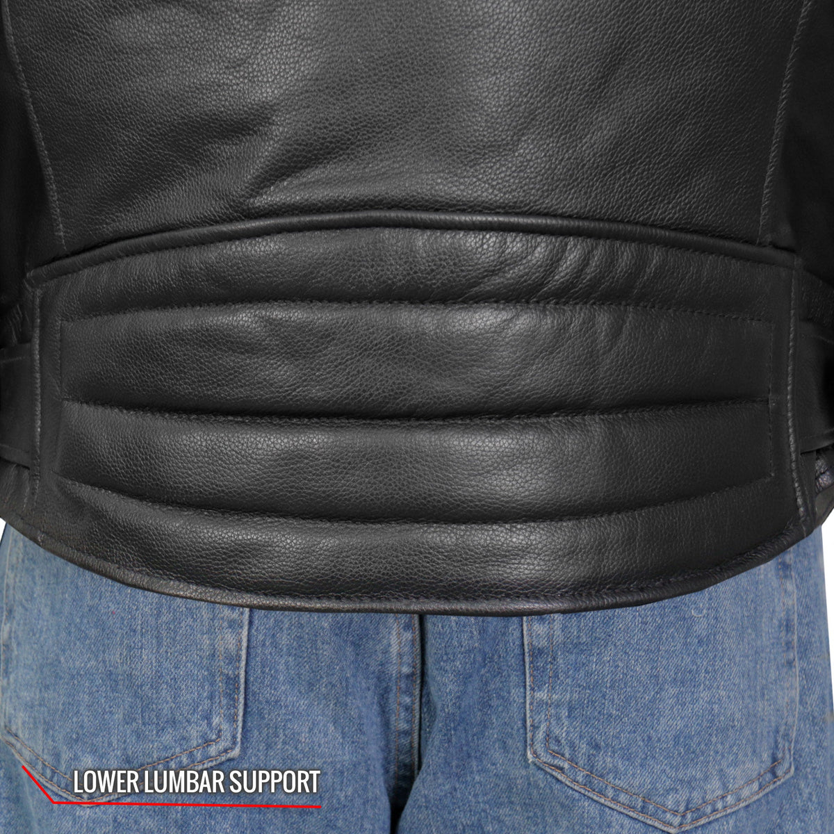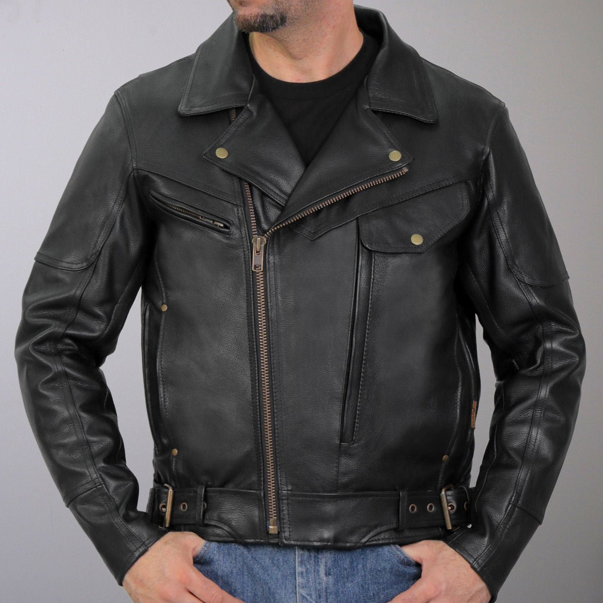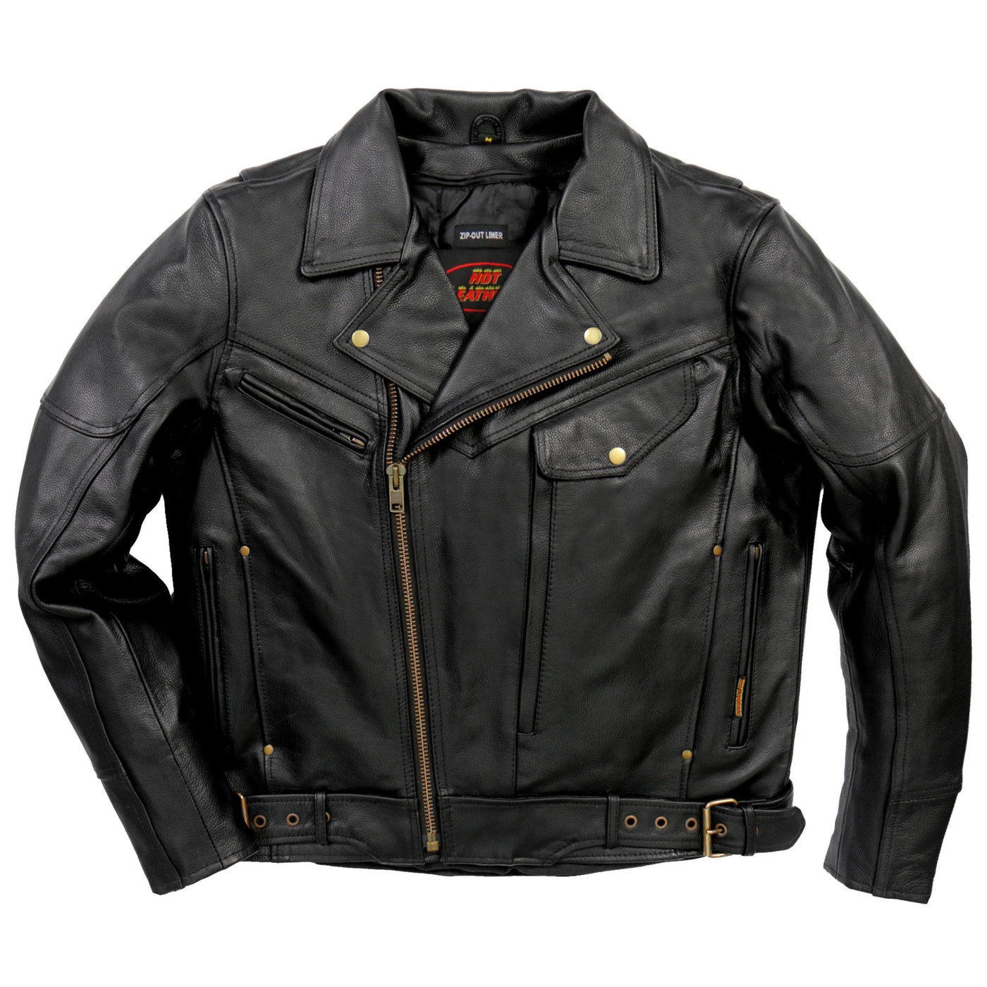 An updated version of the classic leather motorcycle jacket . This Hot Leathers motorcycle jacket is built using heavyweight cowhide & features antique brass YKK zippers, great carry conceal front pocket for easy access & also an extra stash pocket. Several strategically placed vents for that quick cool down needed on a hot day. It has a padded lower back, two inside storage pockets, two front pockets, & a quilted zip out lining. Another great feature on this leather jacket is dual belts on the front for extra comfort while riding.