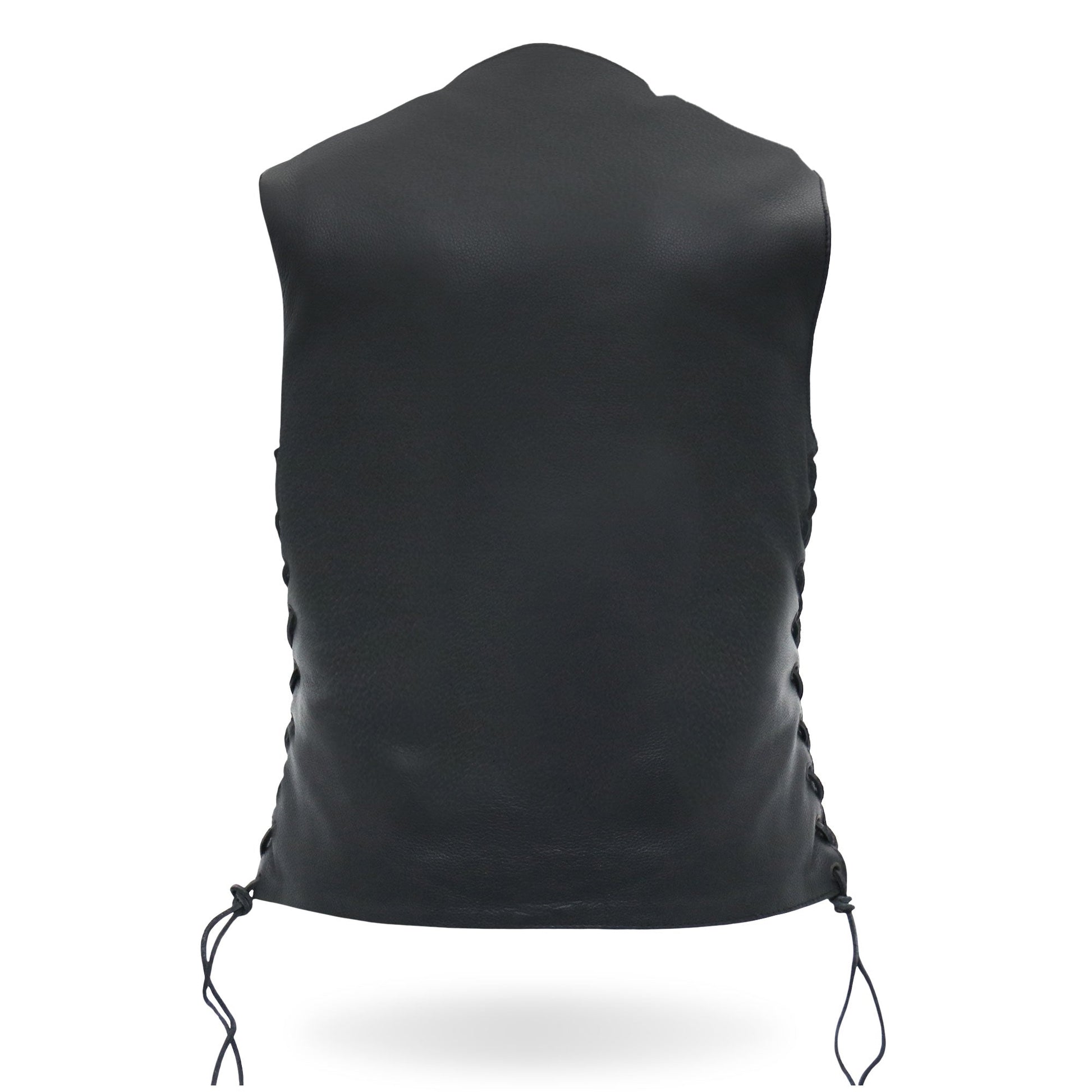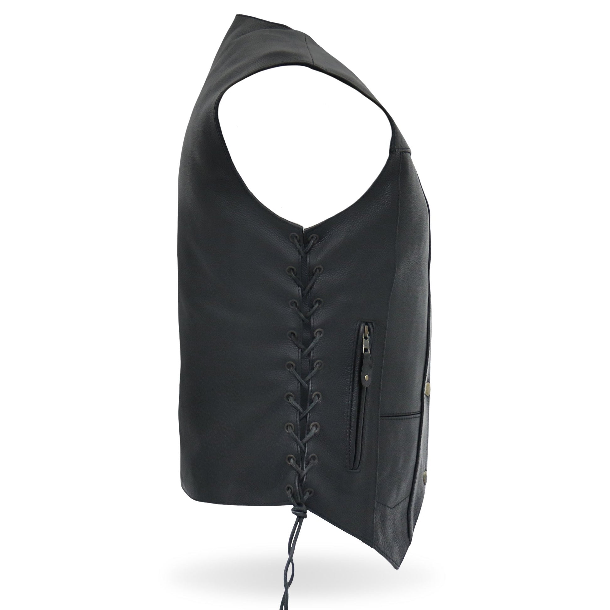 Hot Leathers original ladies 10 pocket riding vest. This vest is built using soft cowhide and features leather 10 pockets inside and out. Lace up sides for that adjustable comfort fit. Four outside pockets & six inside pockets. Plenty of of places to stash stuff for those long rides.