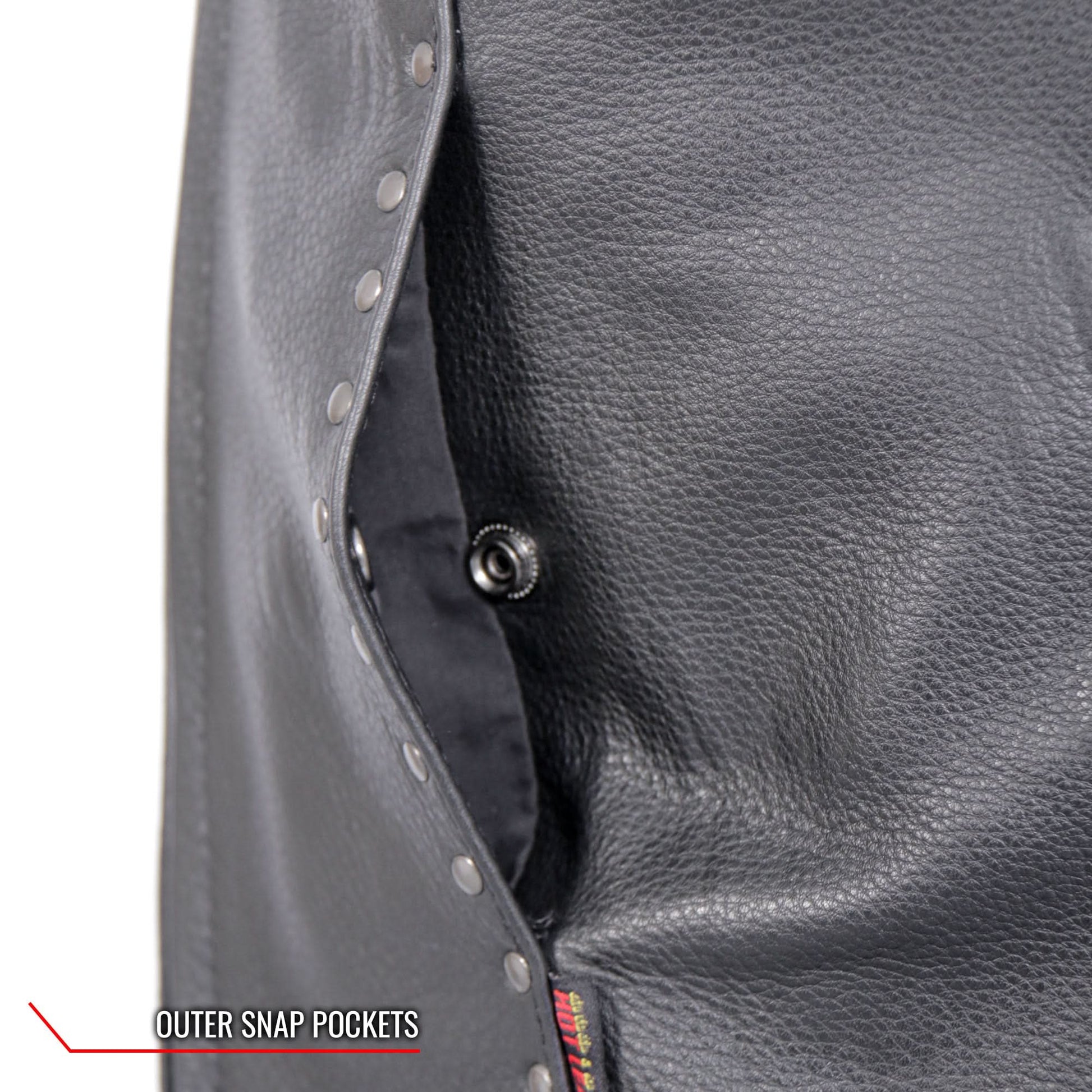 All new ladies leather riding vest from Hot Leathers! This vest is built using naked cowhide and features antique silver stud detail and a full zippered front. There are two outside hidden pockets, dual inside carry conceal pockets and one inside media pocket. It has a solid nylon and mesh combo lining. Another great feature on this vest is the inside hidden patch access zippers. Makes it much easier to have your favorite Hot Leathers patches sewn on.