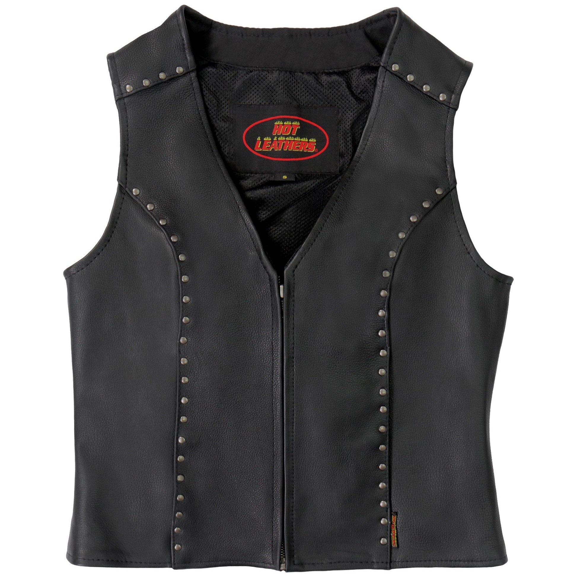 All new ladies leather riding vest from Hot Leathers! This vest is built using naked cowhide and features antique silver stud detail and a full zippered front. There are two outside hidden pockets, dual inside carry conceal pockets and one inside media pocket. It has a solid nylon and mesh combo lining. Another great feature on this vest is the inside hidden patch access zippers. Makes it much easier to have your favorite Hot Leathers patches sewn on.