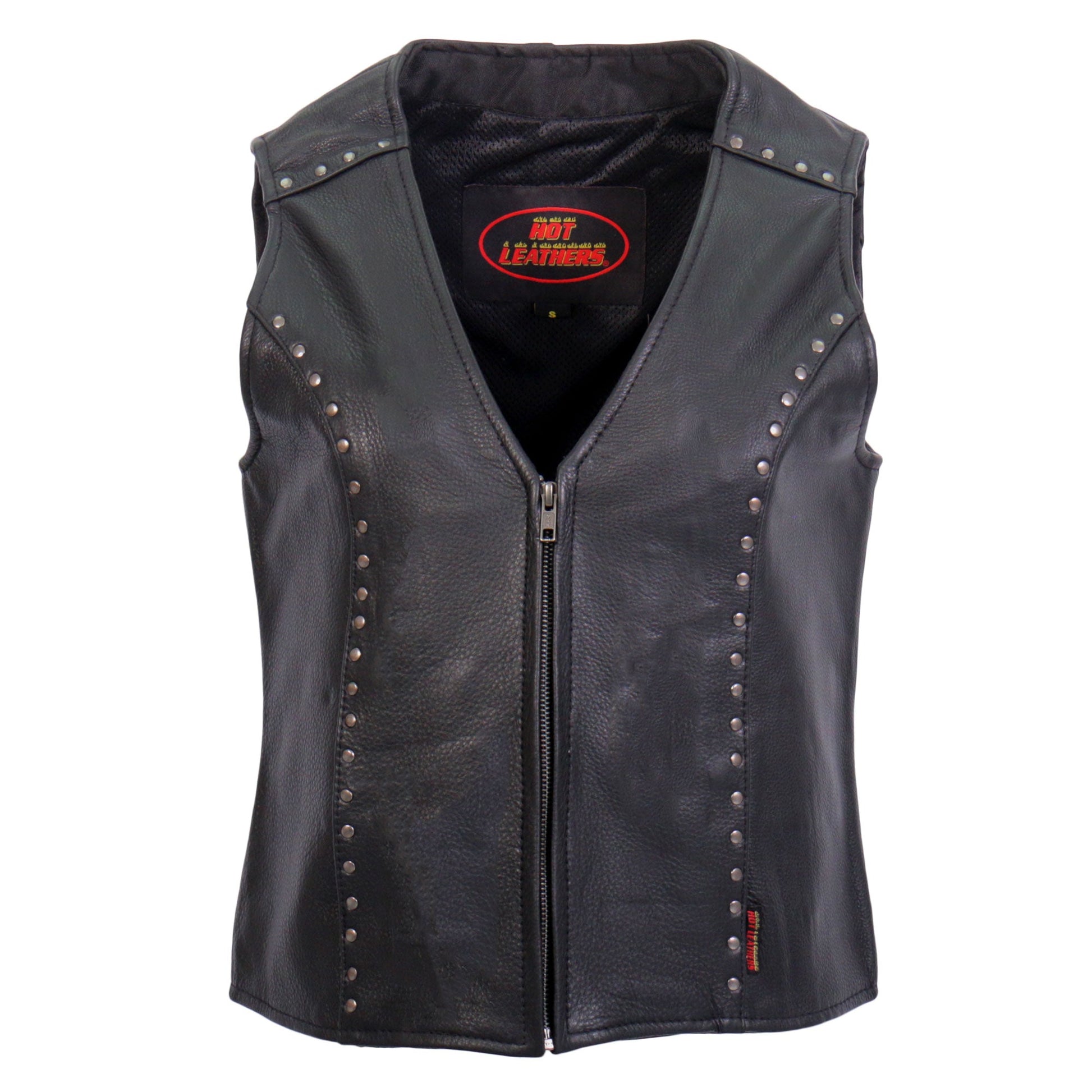 Hot Leathers VSL1015 Ladies Studded Black Motorcycle style Leather Biker Vest with V-Neck Design