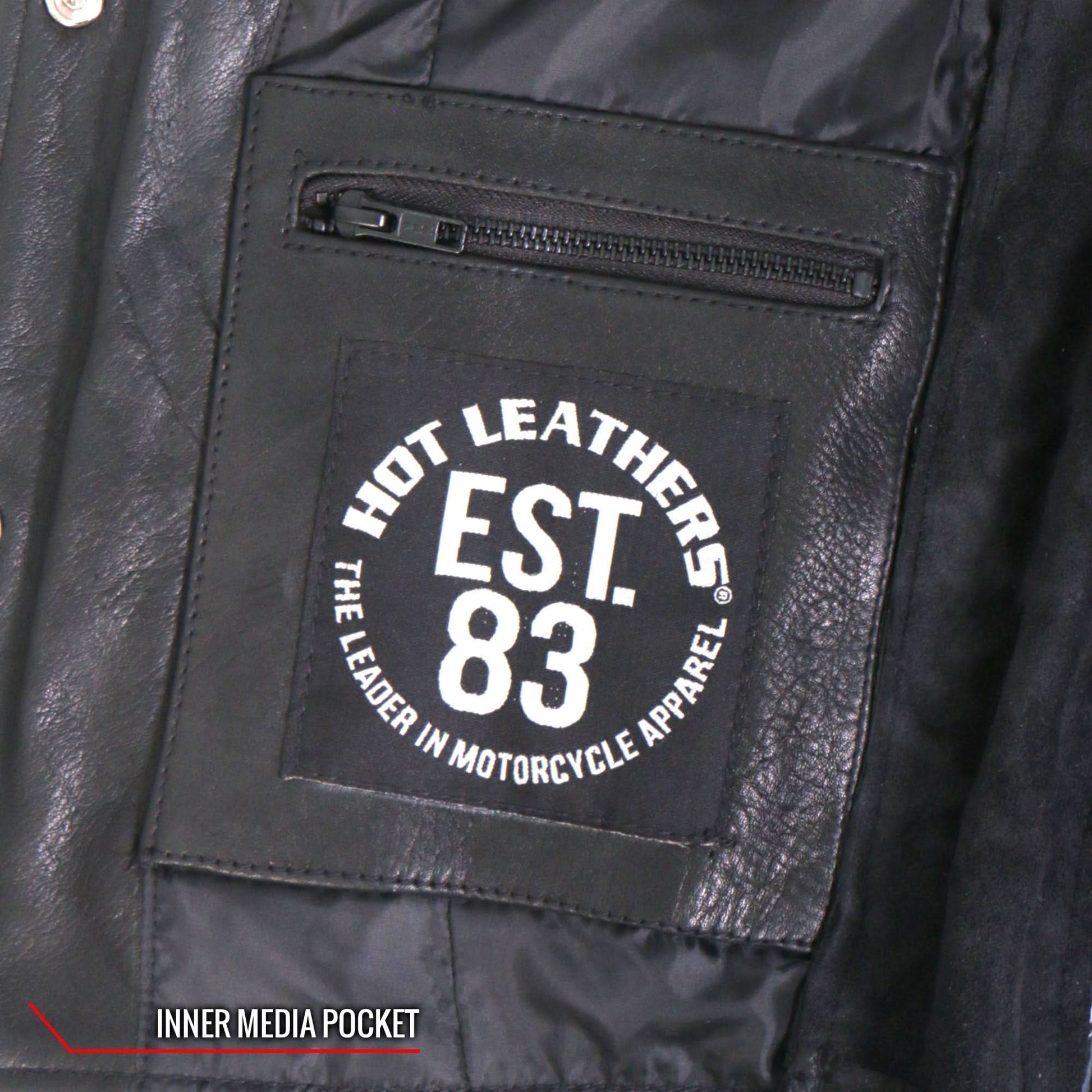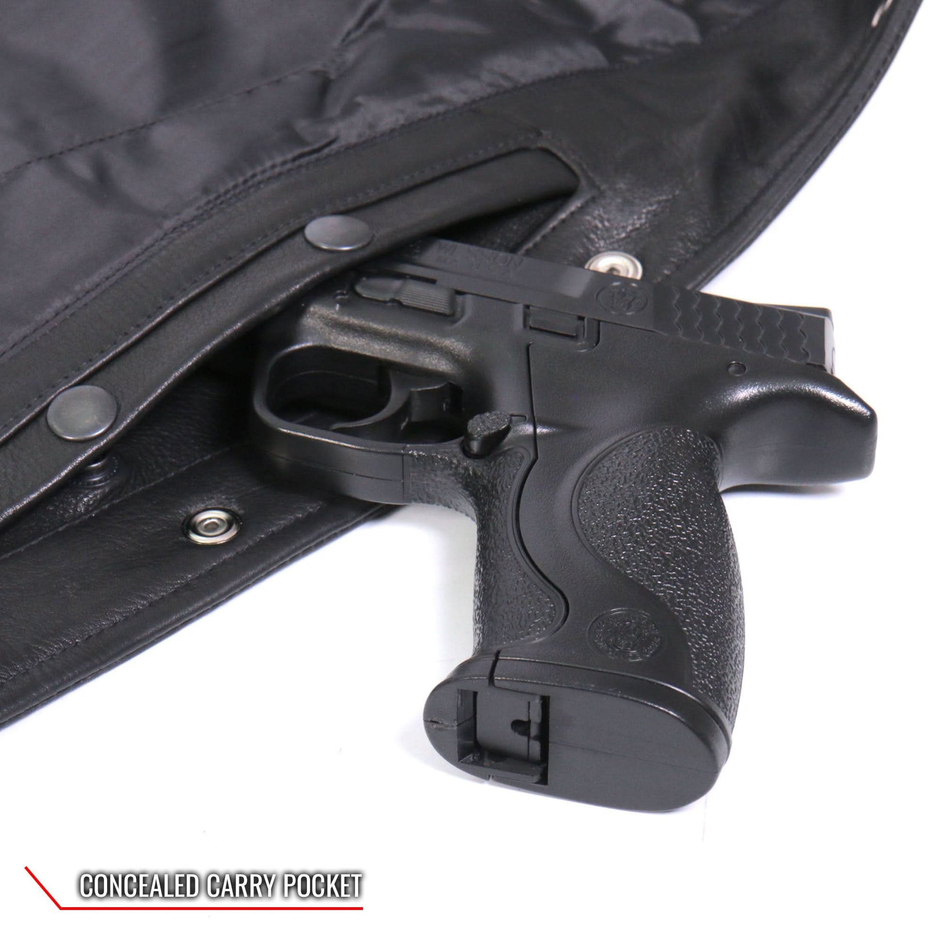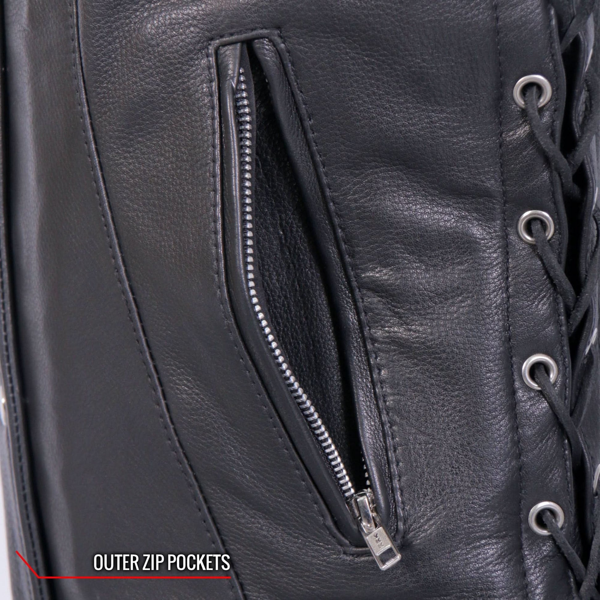 Front V-Neck and 4 snap front. It has front zippered convenience pockets ,inner extra large gun pocket, and a zippered media lipstick pocket .The lining is Hot leathers original art . The side panels offer extra room if necessary , and are tied with the same premium naked leather laces. Best quality inside and out on this vest. Order true to size
