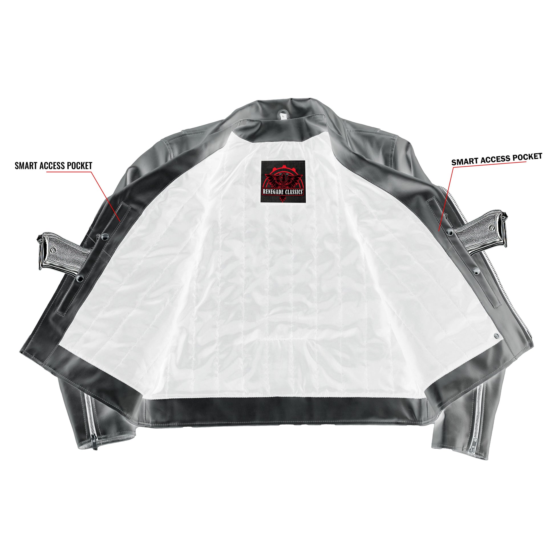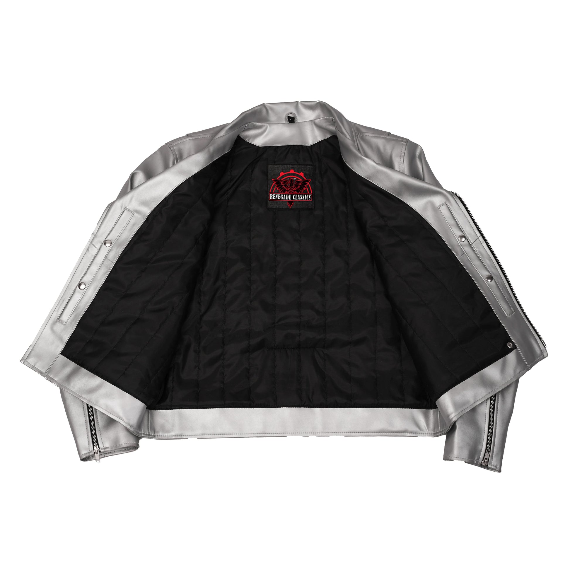 - Traditional biker collar that can be snapped down or worn up.