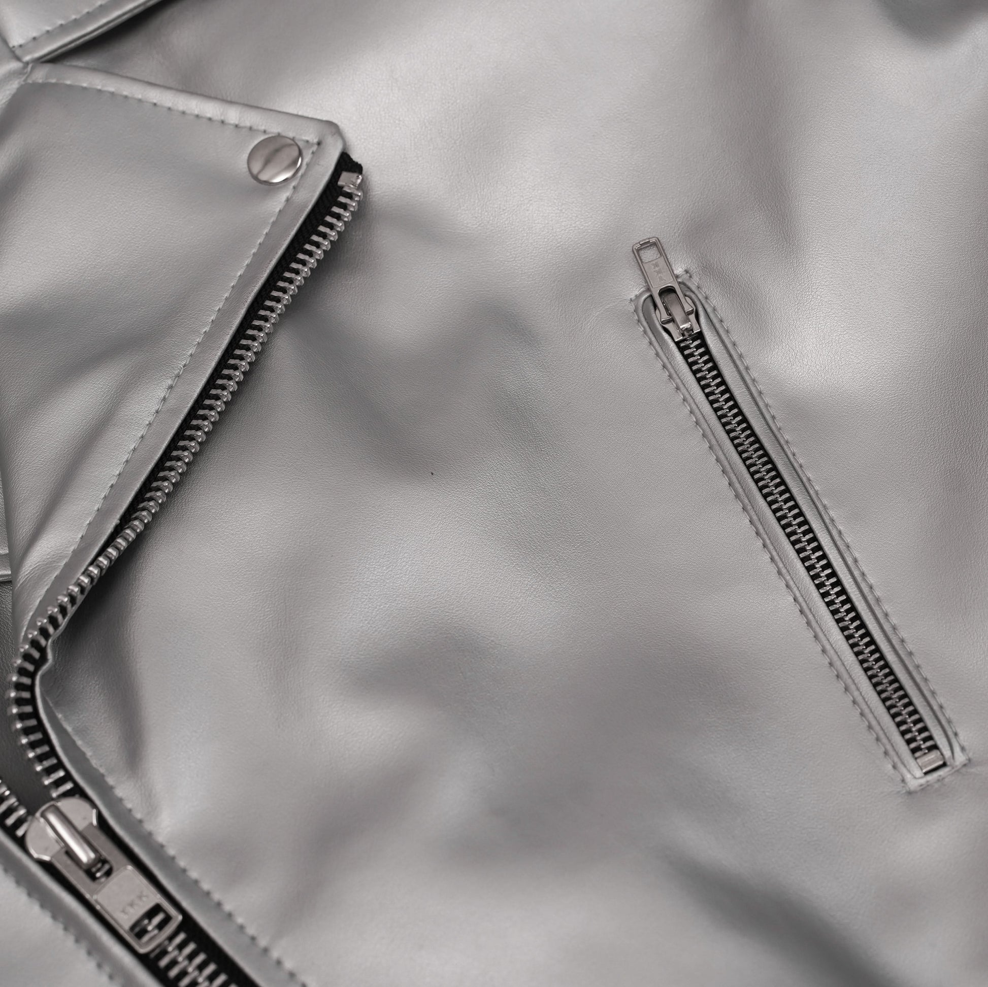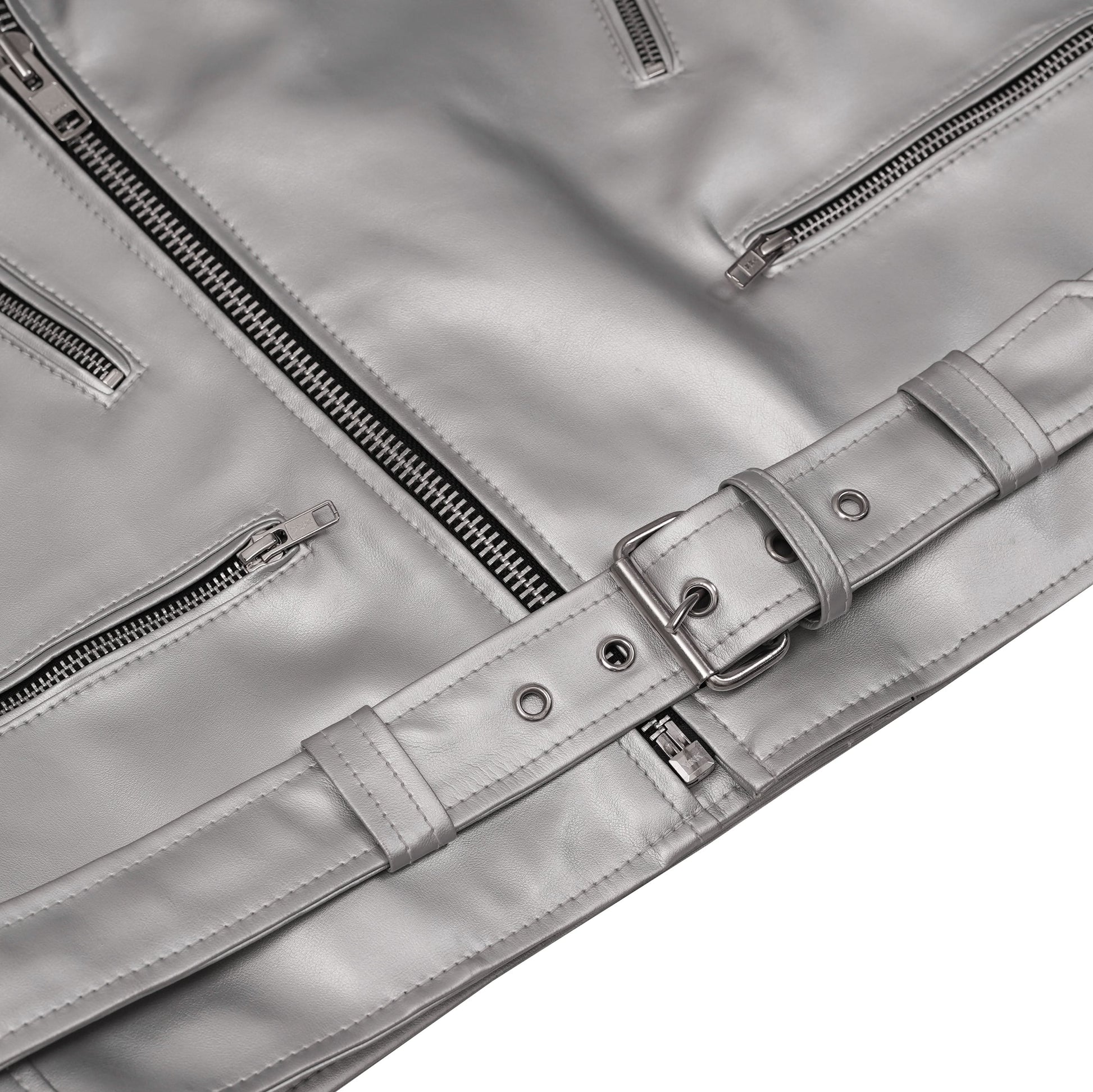 Make a bold statement with the Iron Phantom Leather Motorcycle Jacket. This is not your typical black leather. Its special silver finish requires attention and makes you look different from the crowd. It is made in the timeless asymmetrical biker style. It features rugged zipper details on the front, chest, side pockets, and cuffs. It allows for a custom fit and classic look. The combined waist belt with a buckle ensures a tailored silhouette. Even if you are on the open road or out in the city, the Iron Phantom offers a unique blend of classic rebellion and modern style. It's more than just a jacket; it's an attitude.