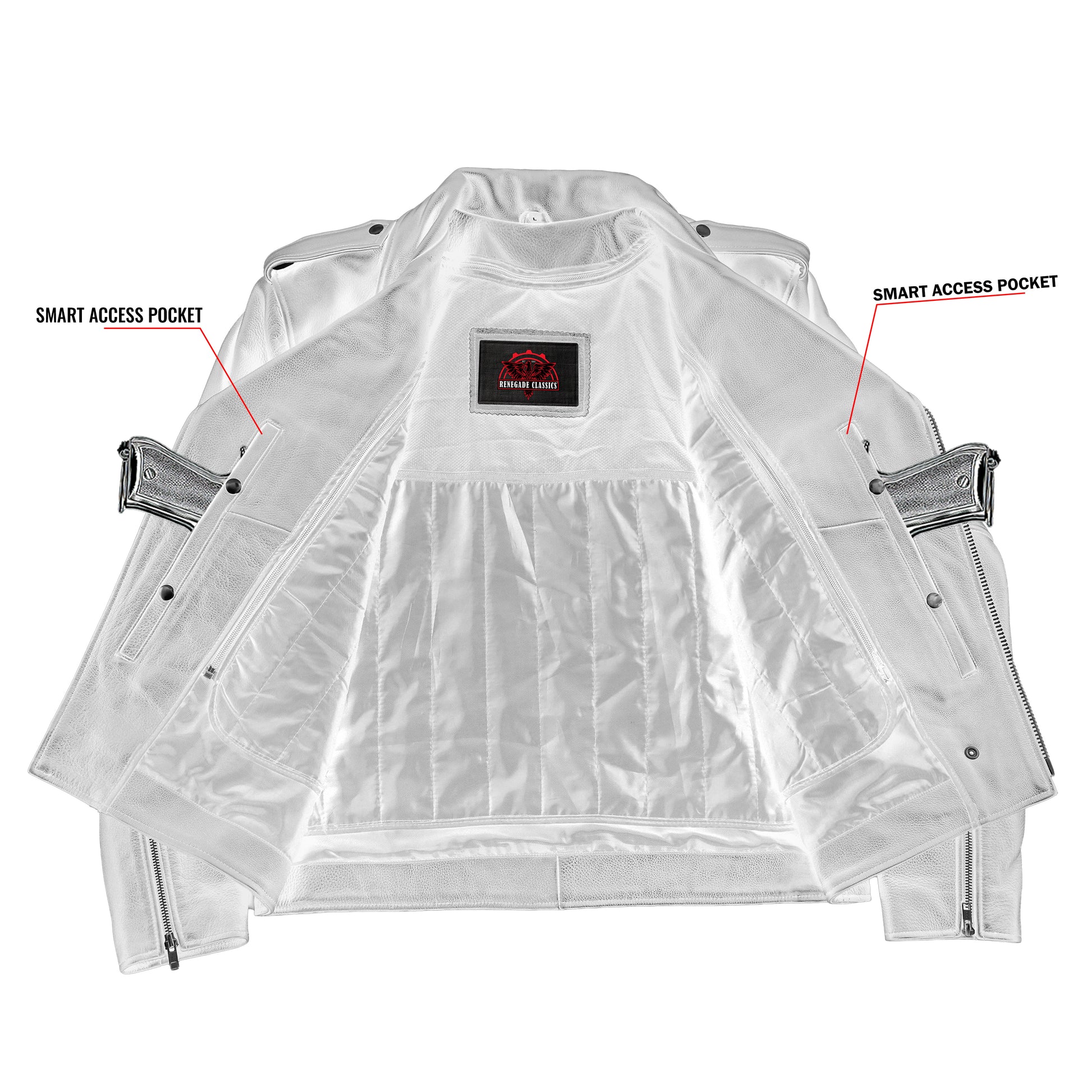 1 inside left-hand side concealed gun pocket made of special heavy-duty textile with built-in holsters and snap closure and 1 regular inside pocket.