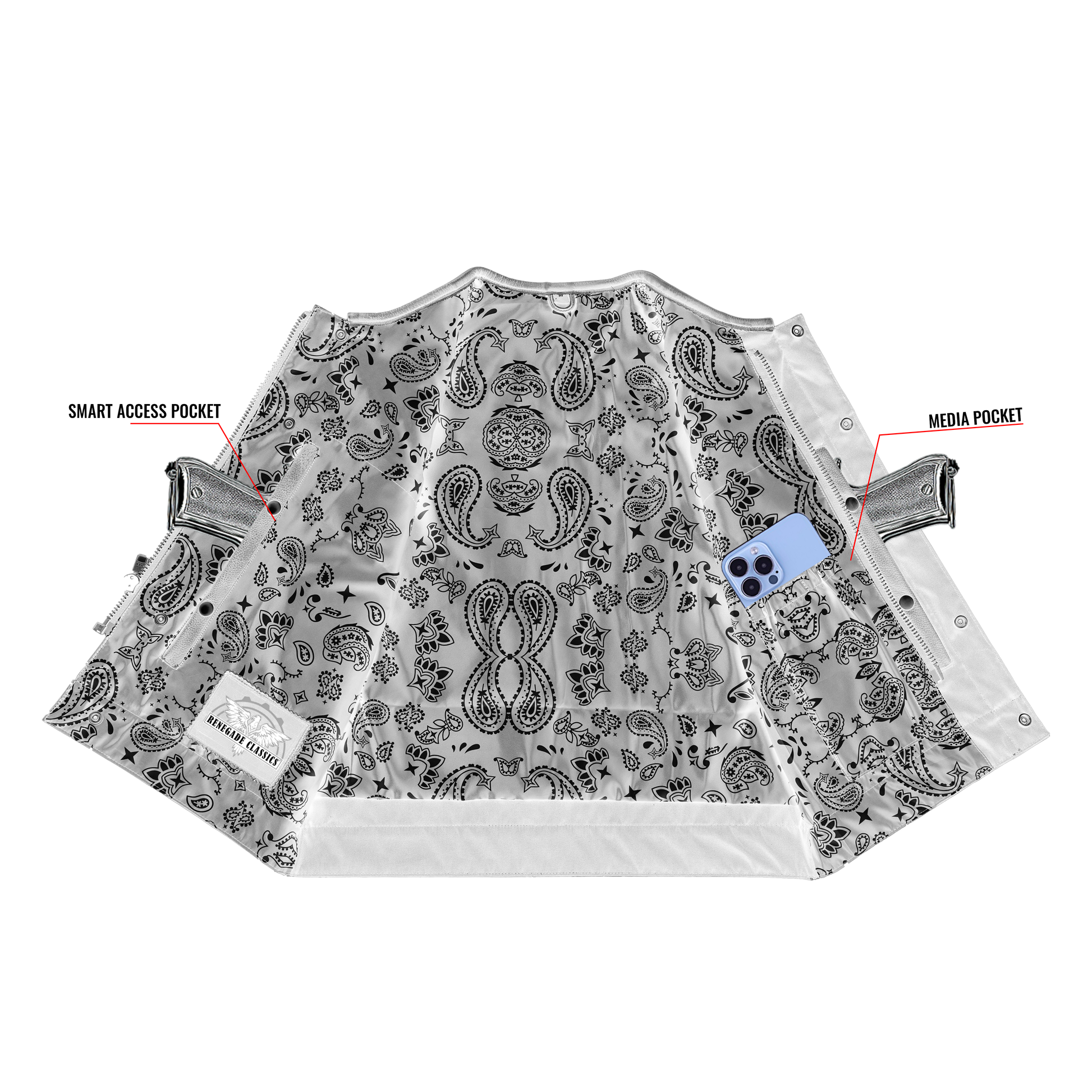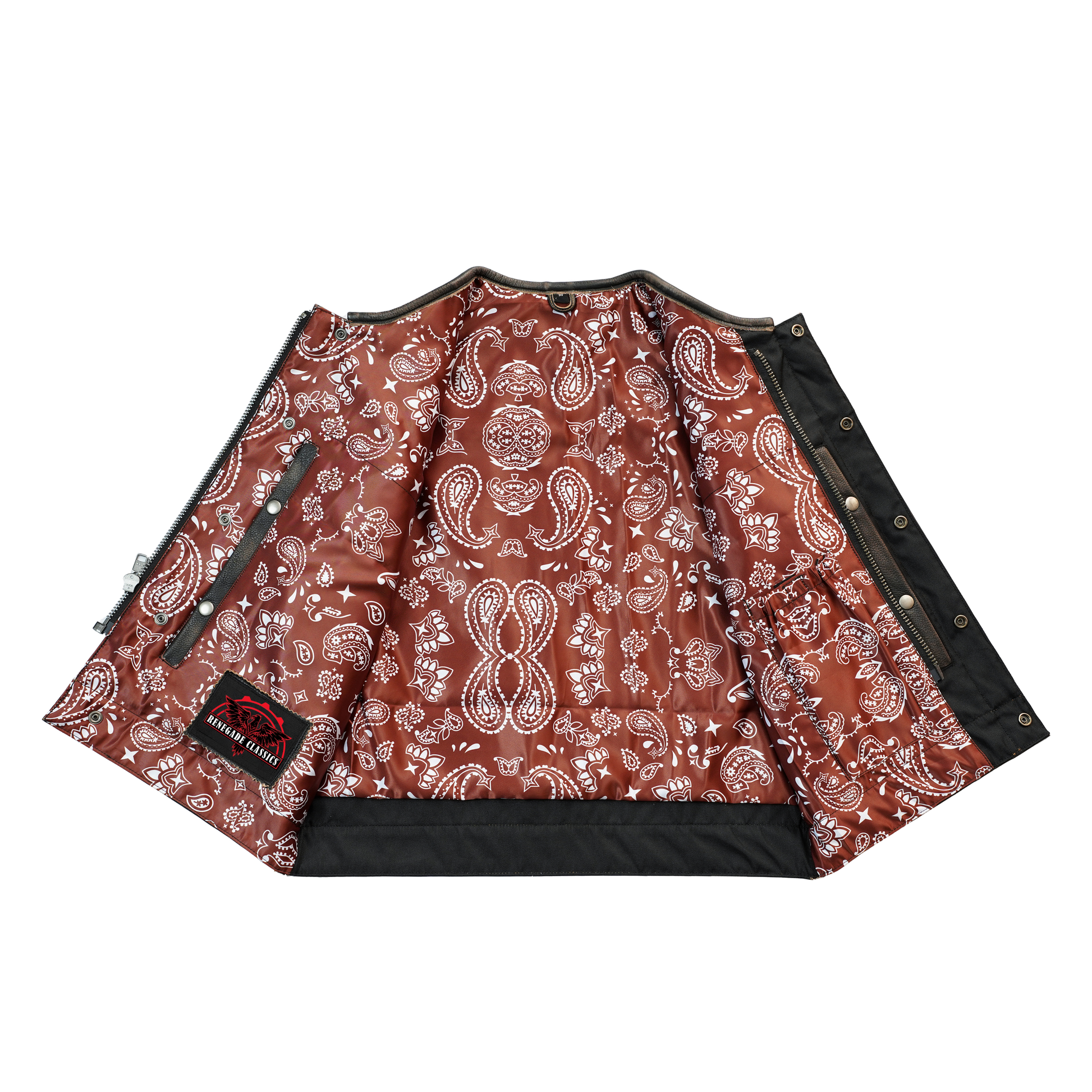 The Liberty Knight Men's Leather Vest is built for those who value rugged strength and timeless appeal. Crafted from premium brown leather, the complete outer shell provides superior durability and a rich, natural finish that ages beautifully over time. Whether you're on your bike or off the road, this vest offers the toughness and sophistication every rider needs. A vintage ruff finish on the outside combined with a paisley-designed inner lining gives it a classic yet bold character. The single-panel back is perfect for personal customization like patches or club logos. The front is equipped with a 24" original YKK metal zipper concealed under a secure snap-placket to guard against wind and rain, ensuring both functionality and style. Equipped with snap-button closures on two hand pockets and two chest pockets, the vest ensures your belongings stay safe and accessible. Inside, you'll find dual gun pockets reinforced with heavy-duty materials and elastic holsters for firearms and magazines - designed with reinforced shoulder support for added strength and structure. Attention to detail is what makes the Harley Knight stand out - from the 1" Velcro closure on the mobile pocket to the 6" and 1.5" elastic bands used for holster and magazine storage. Finished with heavy-thread stitching for long-lasting wear, this vest is more than just a statement - it's built for the road and the rider.