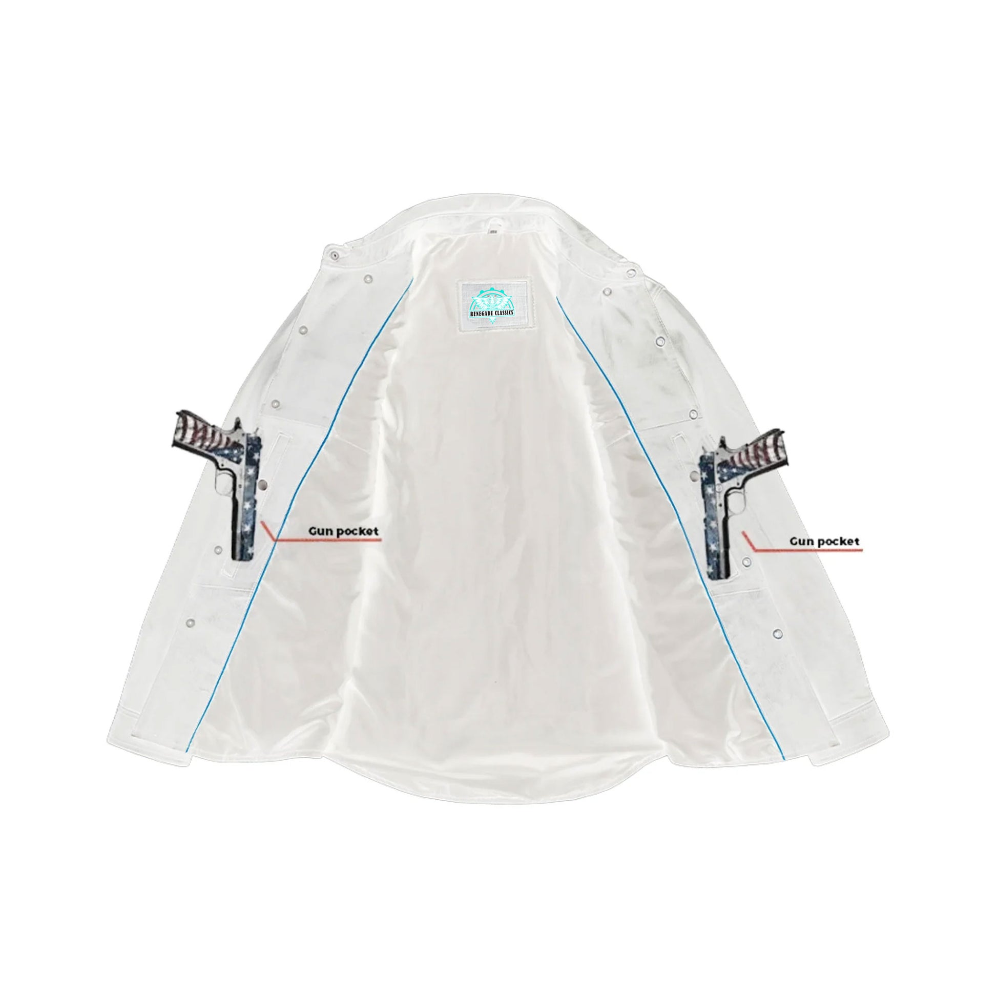 2 inside concealed gun pockets made of special heavy duty textile with built-in holsters and snap closure.