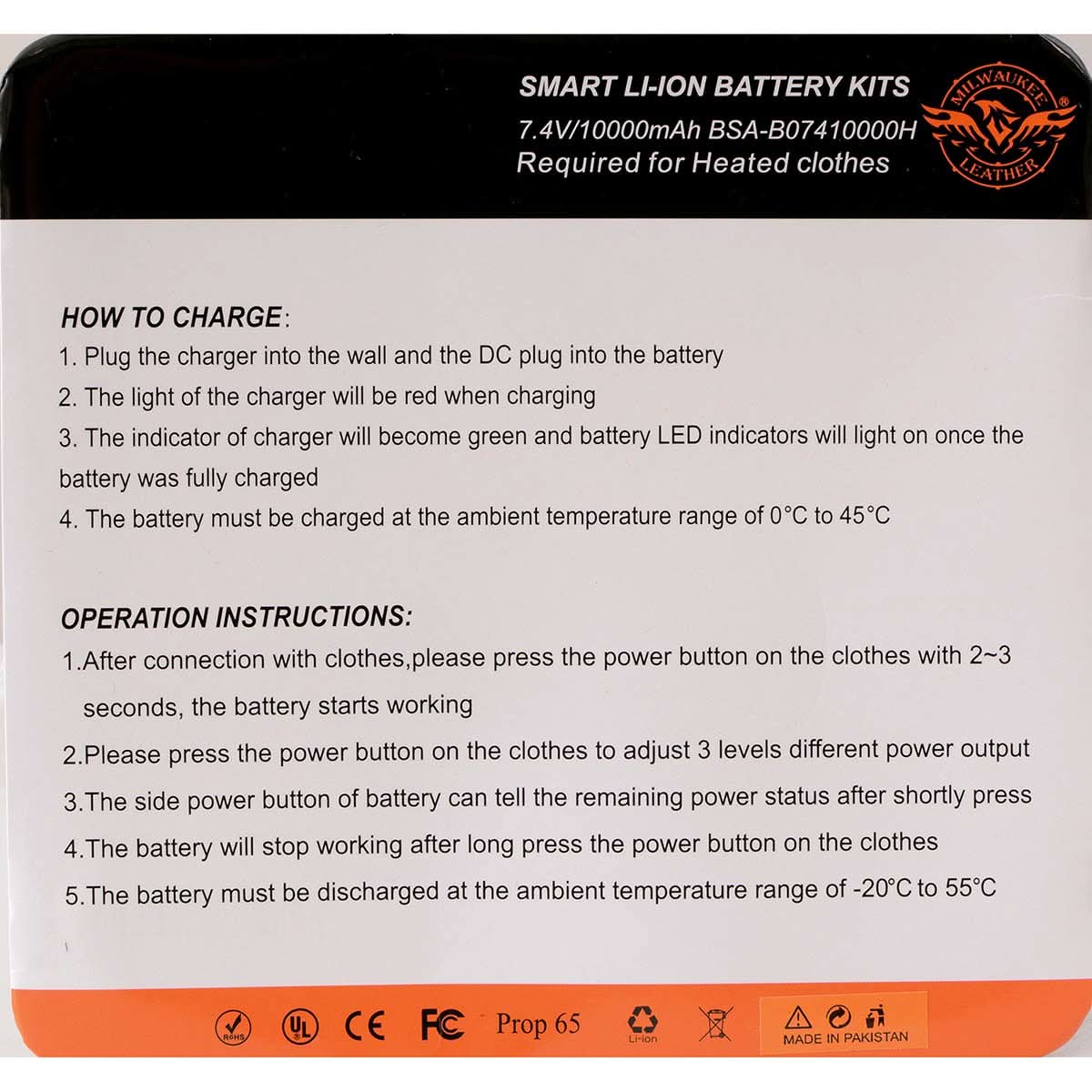 Suggested Use: 1. 7.4v Battery Pack Will ONLY be used on Milwaukee Leather Heated 7.4V Apparel – Batteries will not work if used w/ other 12V heated product. 2. Plug in charged battery to connection cable on Garment. To turn on battery, press and hold on/off for 2-3 seconds until light comes on. 3. When on power starts at 100%, keep on high setting for five to ten minutes to warm up the Hoodie. Turn off the battery during extended breaks or indoors to extend your usage time.