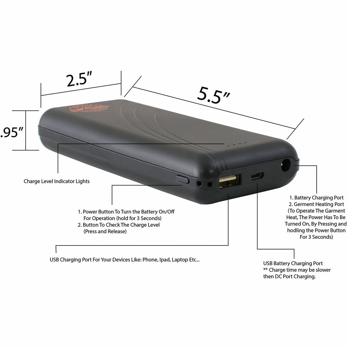 - Triple Heat Setting, Low (10 hours), Med (8 Hours), High (6 Hours). Easy to Read Power Indicator Lights Plug in Wall Adapter 7.4V 10,000mAh Lithium-Ion battery USB for Charging your Devices like (iPad, Smart Phone, Laptops Etc…)
