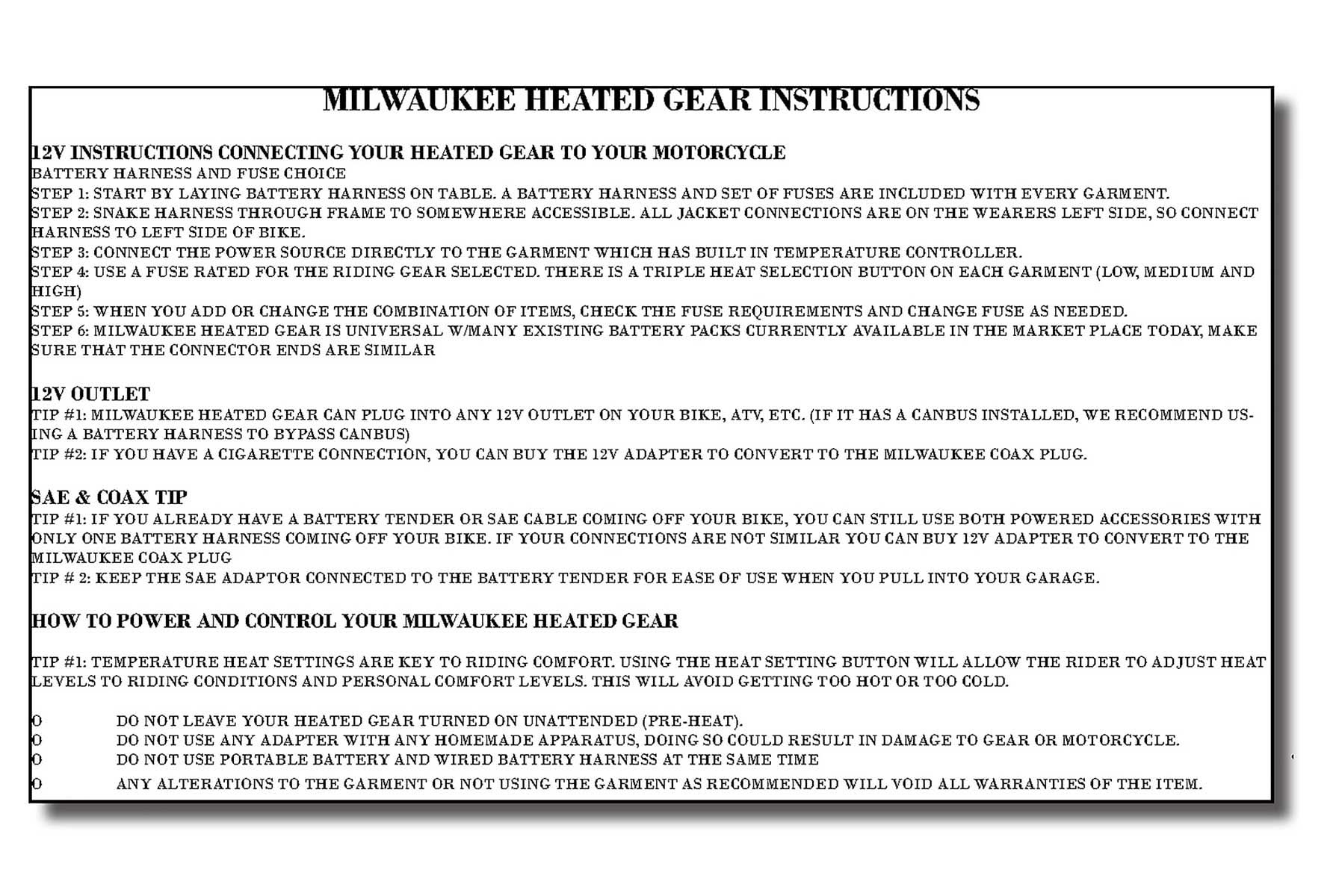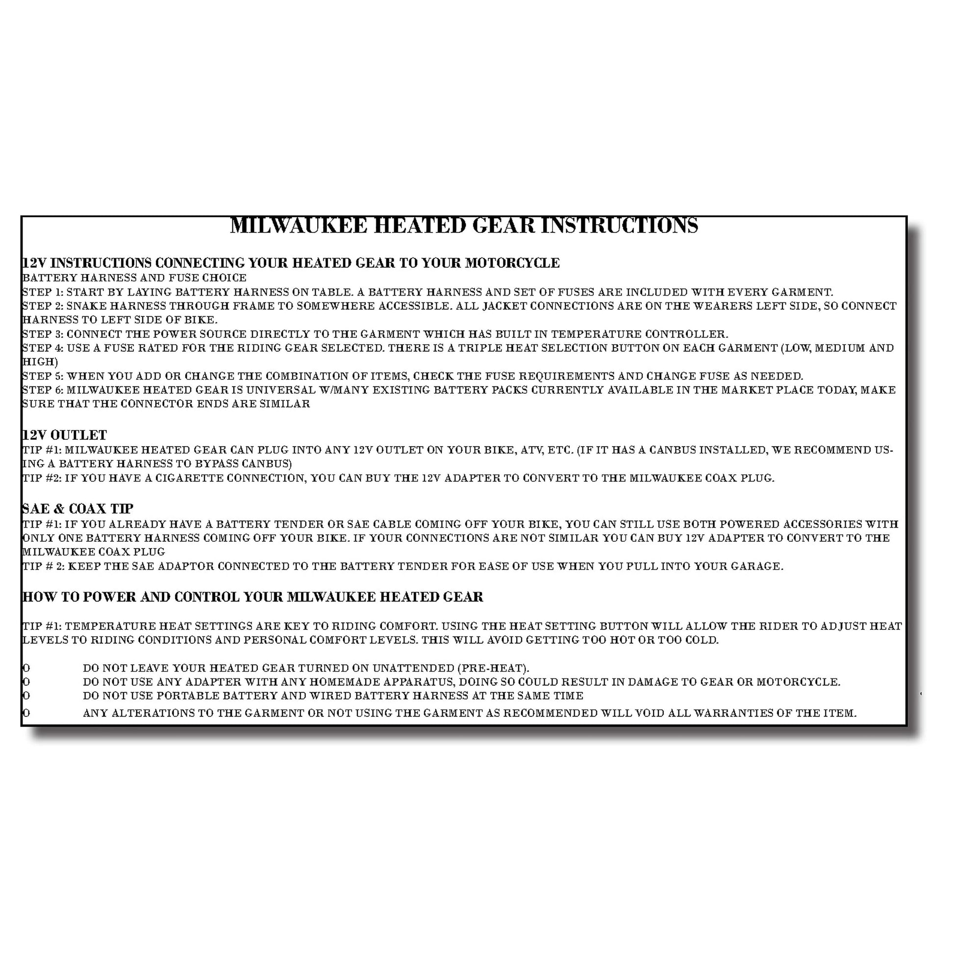 To Activate the Heat, You Simply Connect into The Motorcycle Power Lead Through an Included 12V Wired Battery Harness That Hooks Up to Your Motorcycle's Battery and Then to The Jacket.