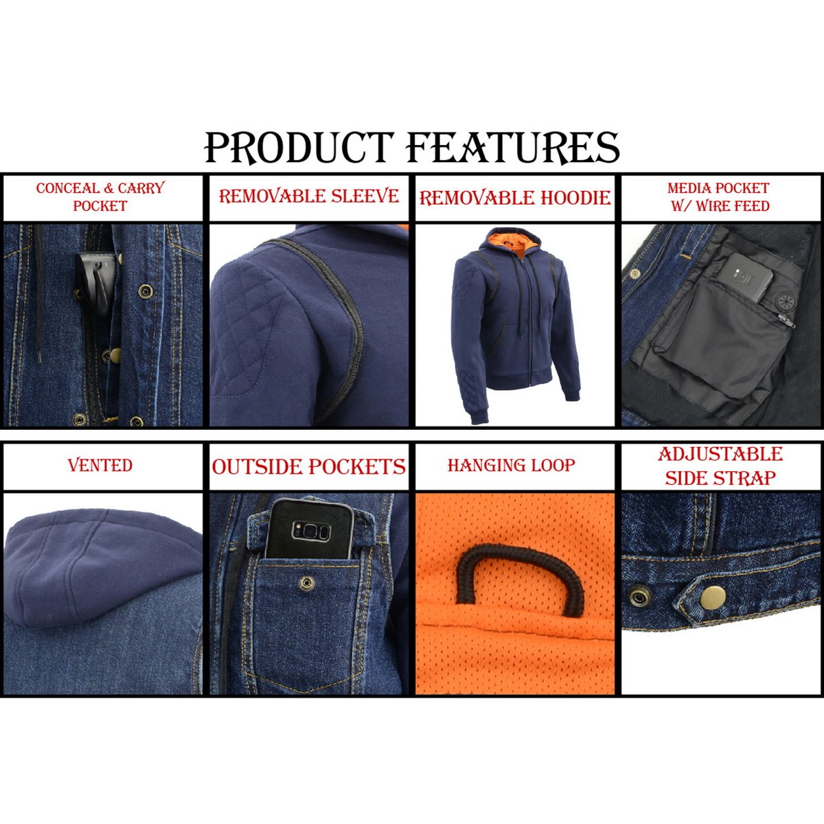 Milwaukee Leather MDM3020 Men's Black Denim ‘5 in 1’ Club Style Vest with Fully Removable Hoodie Jacket