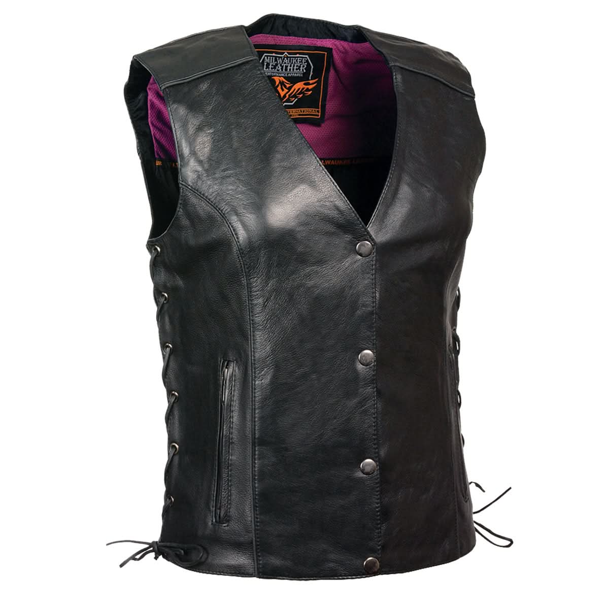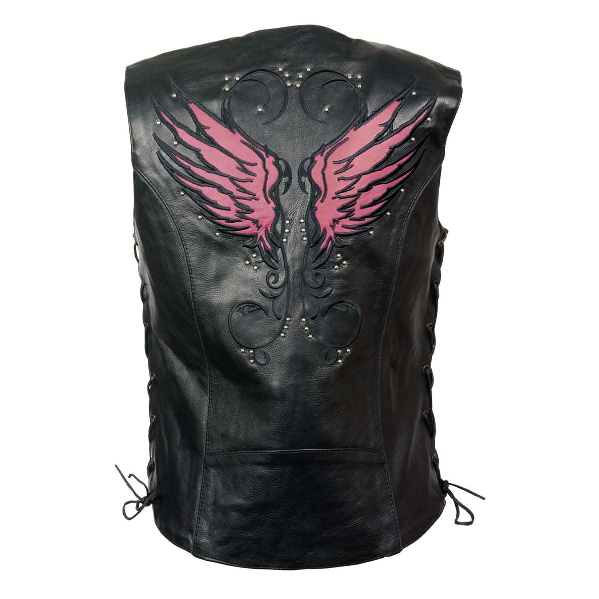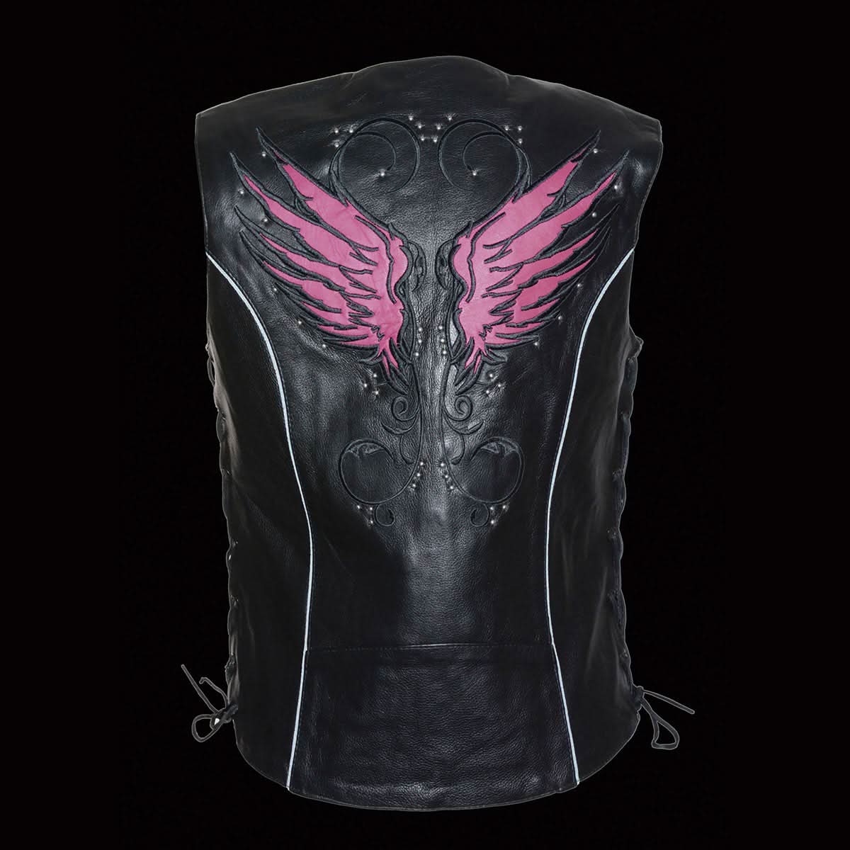 Milwaukee Leather MLL4505 Women's Black Leather Side Lace Motorcycle Rider Vest- Reflective and Studded Pink Wings