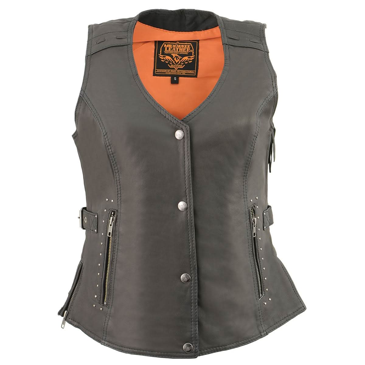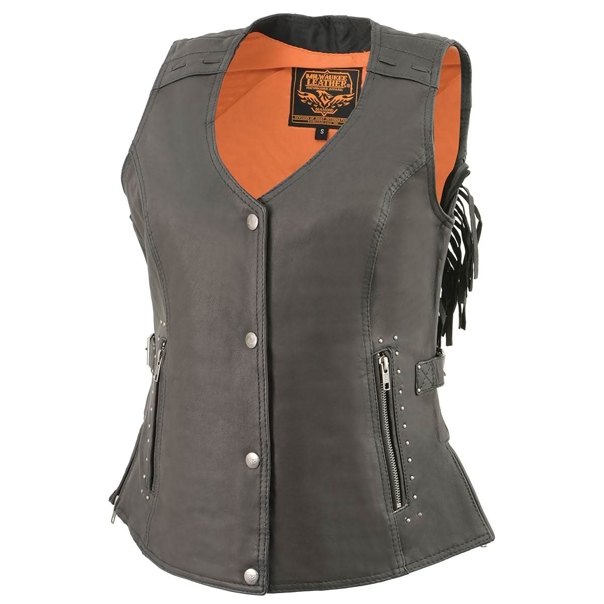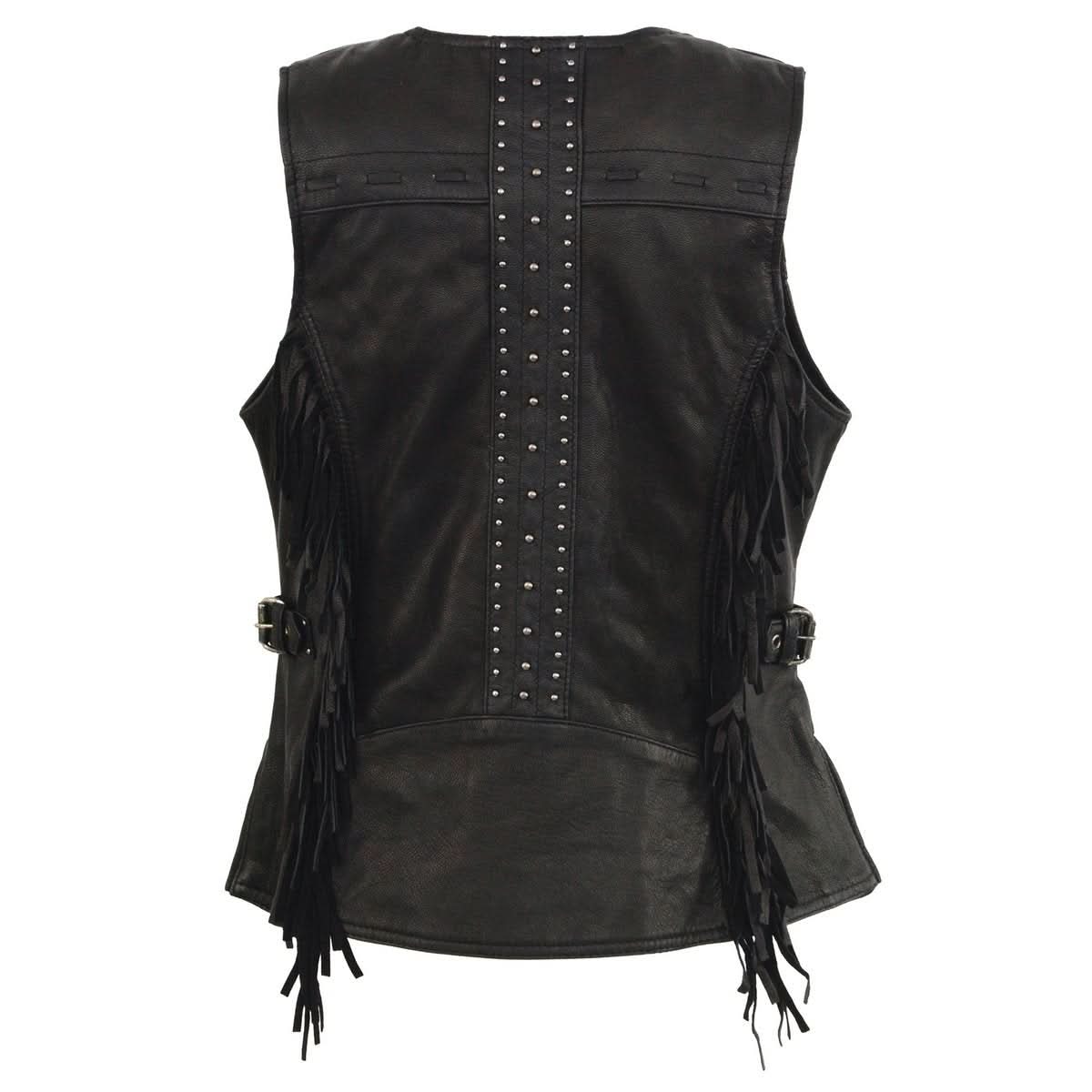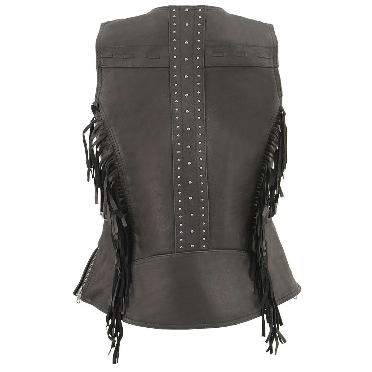 Milwaukee Leather MLL4565 Women's Black Fringed Leather Rivet Detail Side Buckle and Zipper Motorcycle Rider Vest