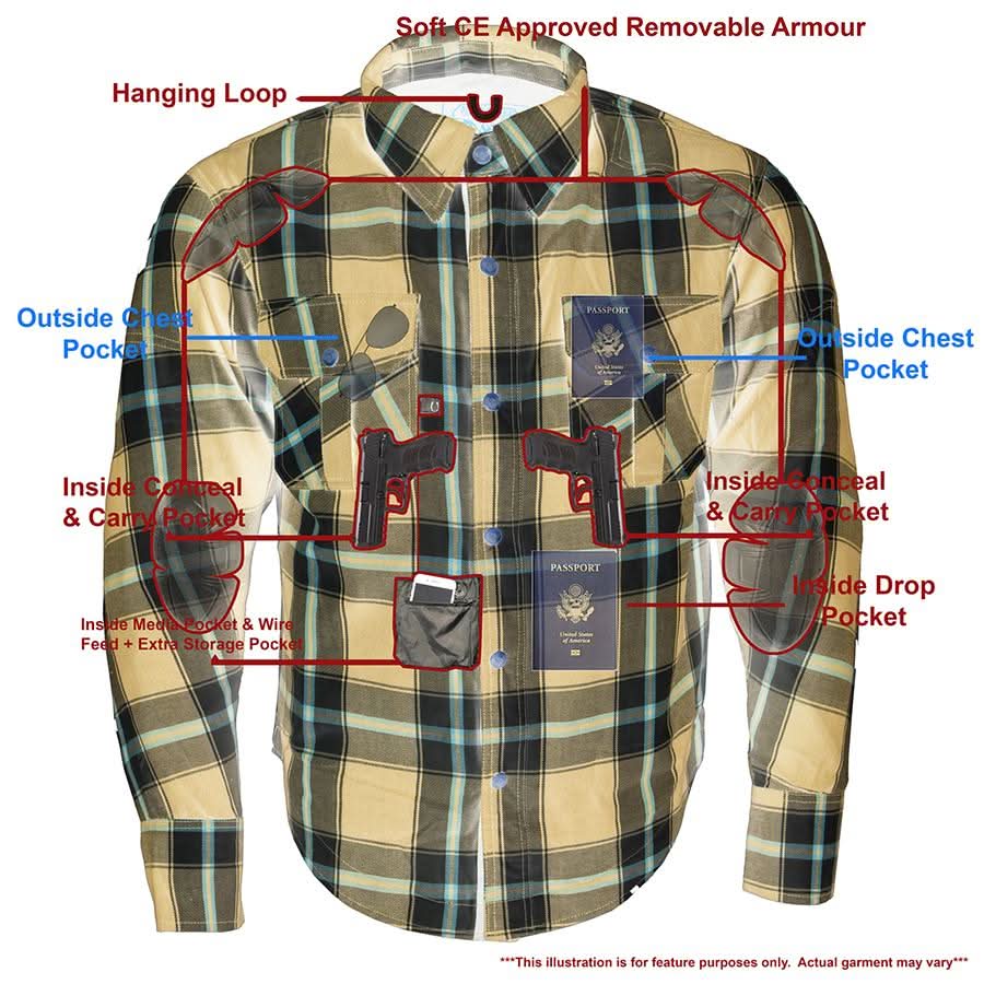 Milwaukee Leather MPM1645 Men's Plaid Flannel Biker Shirt with CE Approved Armor - Reinforced w/ Aramid Fiber