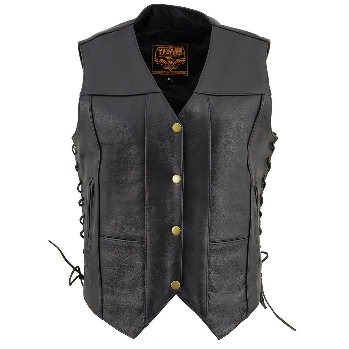 Milwaukee Leather SH1292 Women's Black Leather Side Lace 6 Pocket Motorcycle Rider Vest- Antique Color Snap Closure