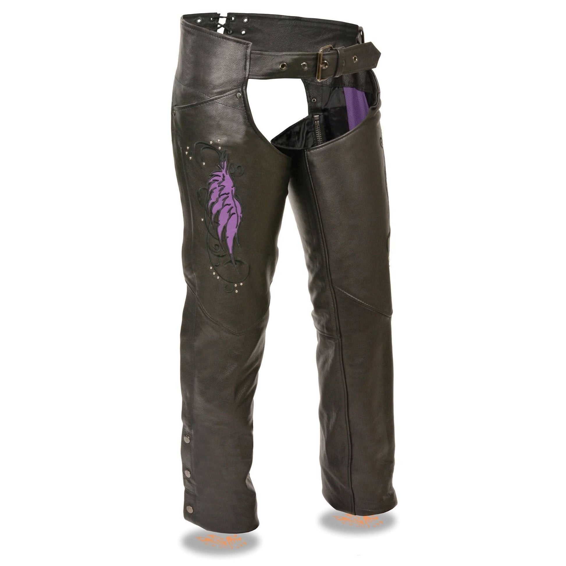 Milwaukee Leather ML1179 Women's Black with Purple Leather Motorcycle Chaps with Wing Embroidery