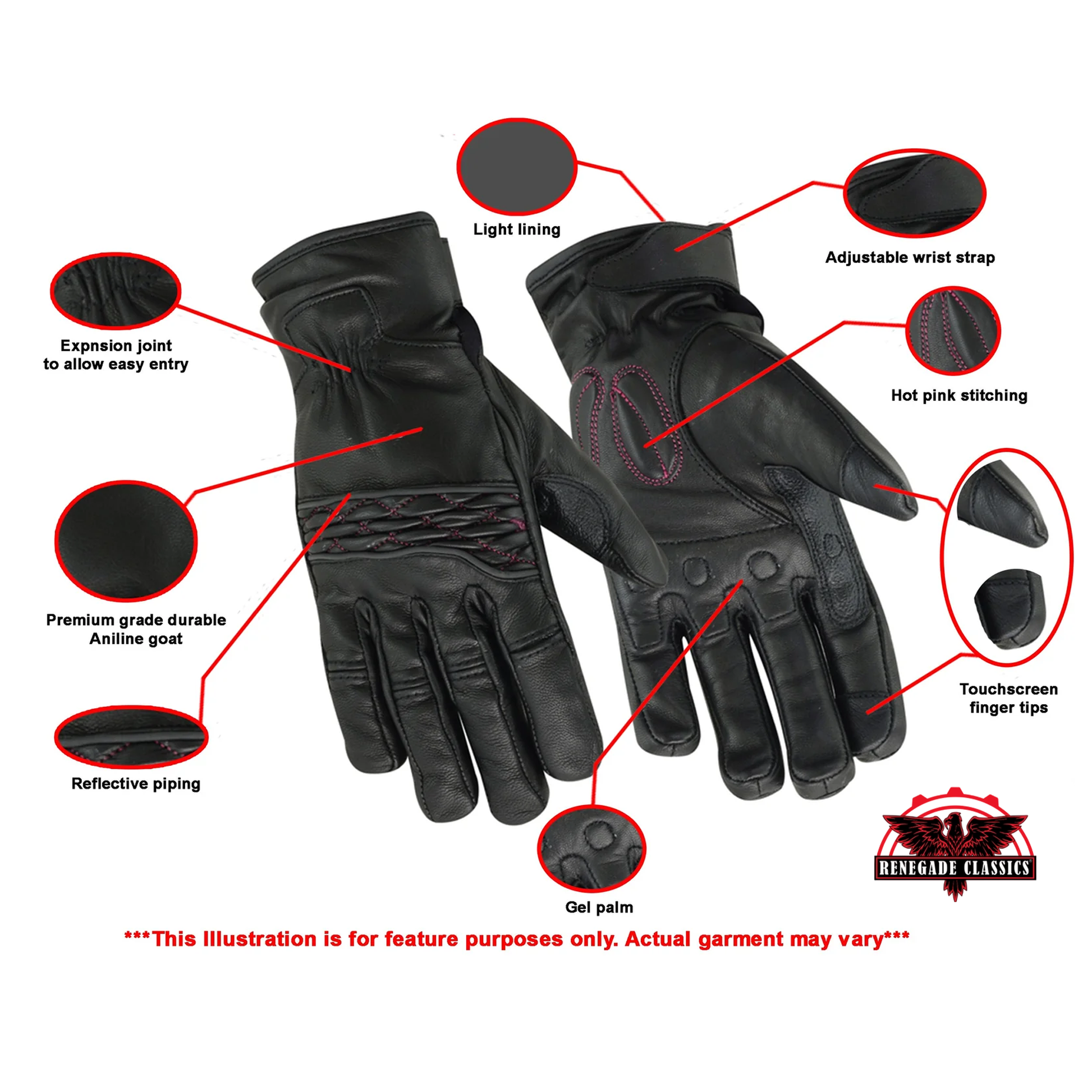 Women's glove made with premium grade durable Aniline goat featuring contrasting hot pink stitching, gel palm, touch screen finger tips, reflective piping, light lining and adjustable wrist strap.