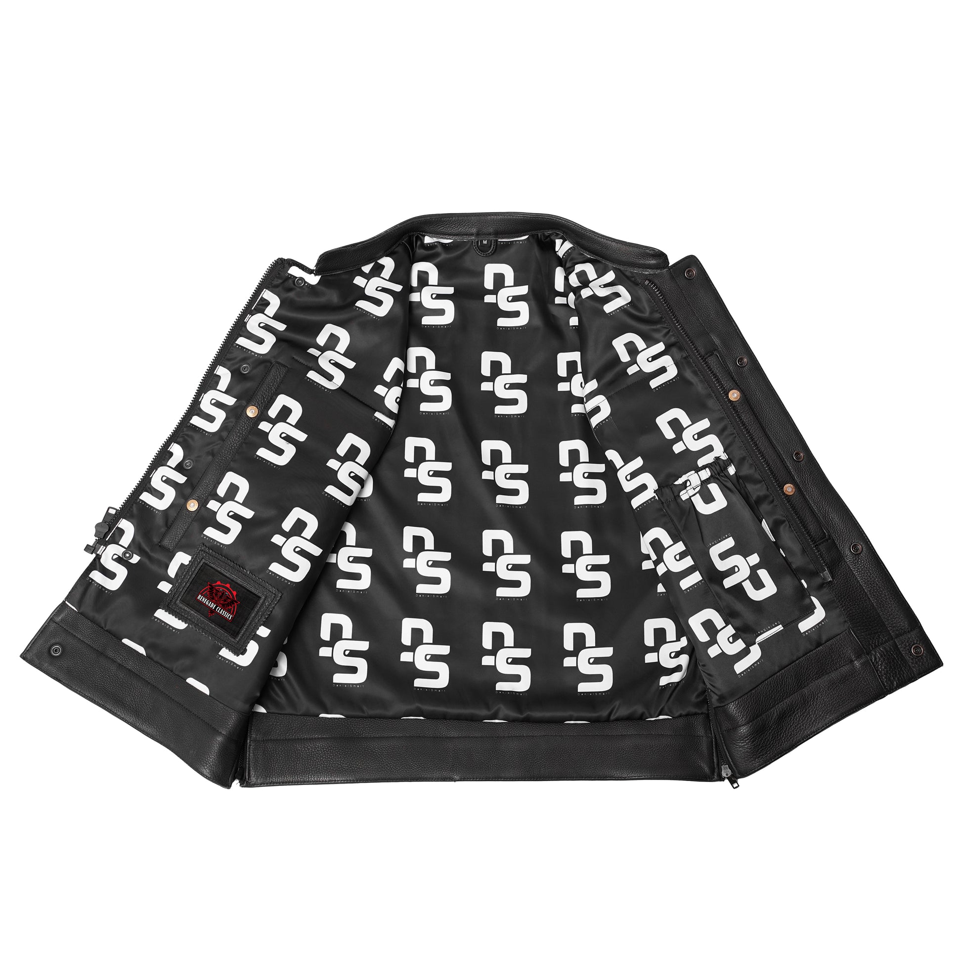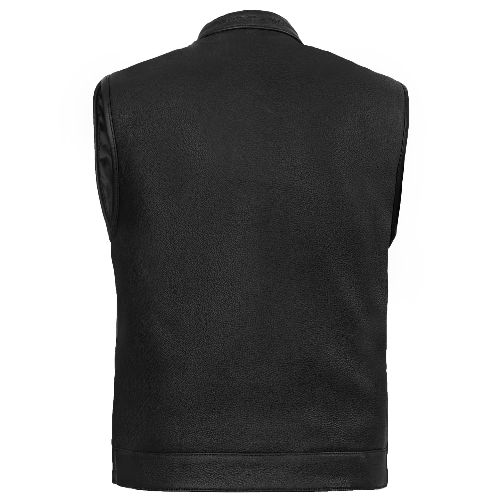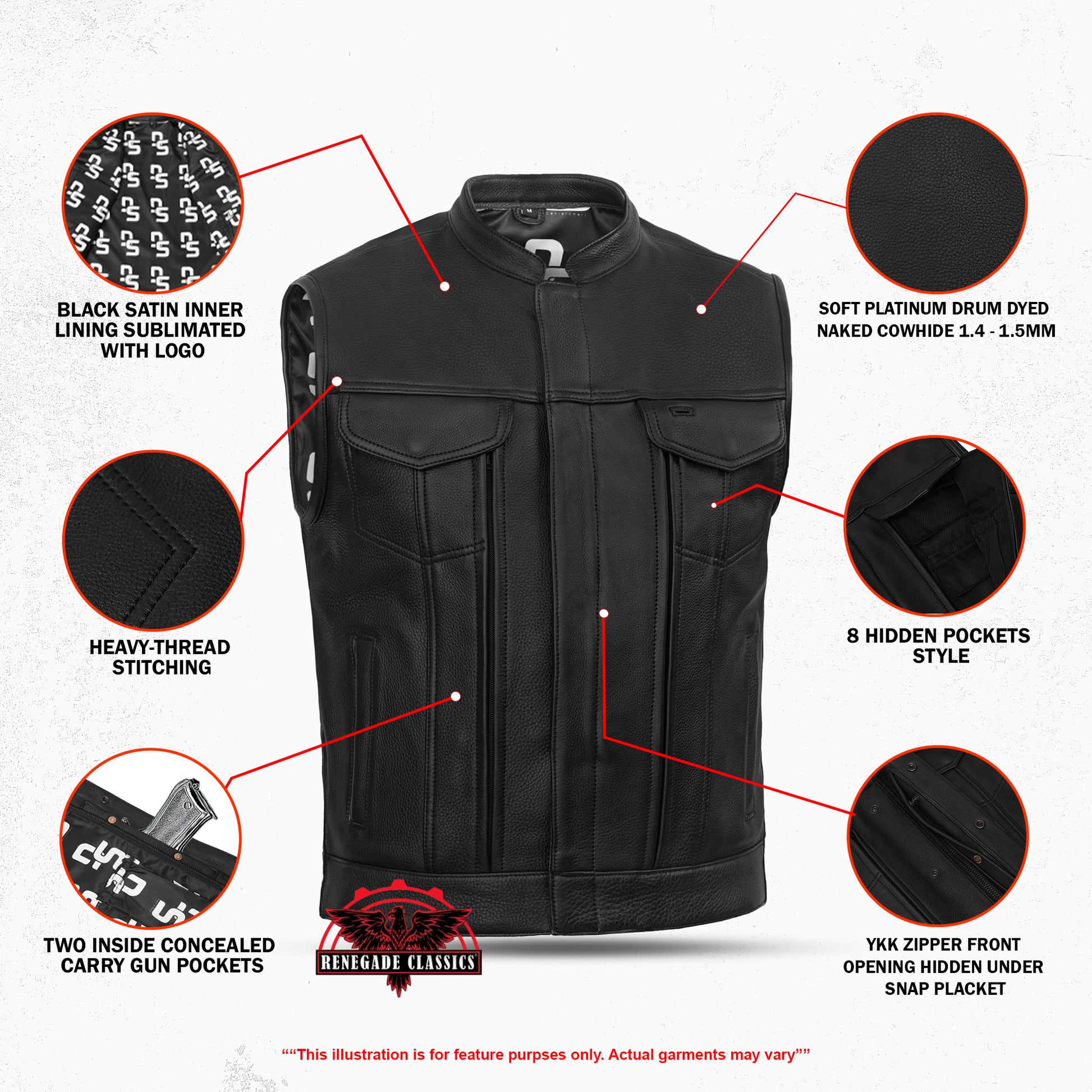NightSentinel Leather Vest For Men is built tough for the rider who demands both protection and mobility. Made from 1.4–1.5 mm premium soft platinum drum-dyed naked cowhide, it features a stand collar, straight hem, and vertical stitched panels for a precise fit. The front zipper is hidden under a snap placket, with V2 utility pockets offering eight hidden storage points. Codura 600D reinforcement and heavy thread stitching add durability where it counts. Interior satin lining with FL sublimation, elastic holster supports, and Velcro placements keep essentials secure. Original YKK zippers and brass hardware ensure long-term performance. Designed for layering, movement, and street-ready style.