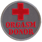 Orgasm Donor patch is 3 inches round. Somewhat made like a first aid patch. Embroidered in red over gray.
