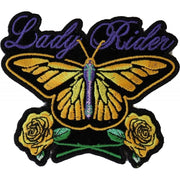Lady Rider Butterfly with Yellow Roses Small Patch measures 4x4 inches and is embroidered in Black / Yellow / Purple / Orange . You can sew or iron on this patch to your clothing. Never iron on patches to leather or nylon material.