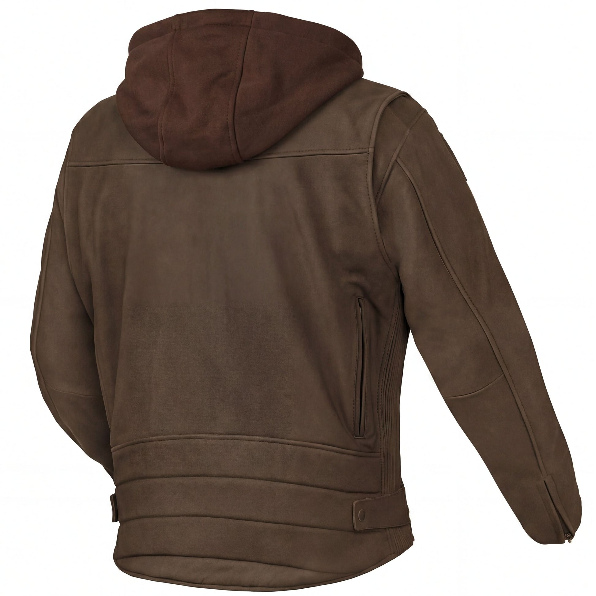 Rancher’s Edge Men’s Motorcycle Leather Jacket is crafted from premium cow suede leather (1.1–1.2 mm), providing a rugged yet refined feel built for long rides. Designed with a banded collar, removable hood, and adjustable side waist belts with cinched leather panels, it offers a comfortable fit across different body shapes. Multiple zippered pockets, inside and out, keep essentials secure, while the soft plaid inner lining adds warmth and style. Finished with reinforced shoulder panels, action back stretch, dual rear vents, and lower kidney padding, the Rancher’s Edge is made for comfort, durability, and confidence on every ride.