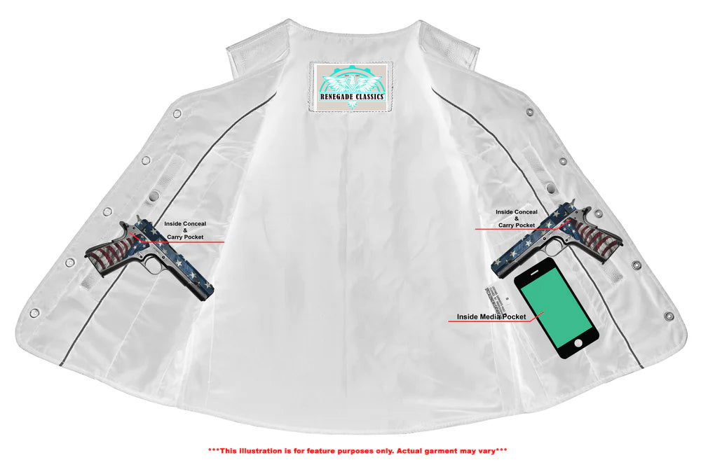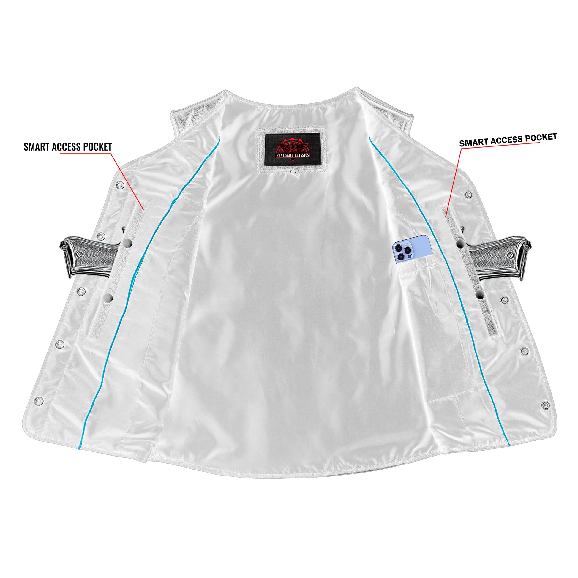 2 inside concealed gun pockets made of special heavy duty textile with built-in holsters and snap closure.